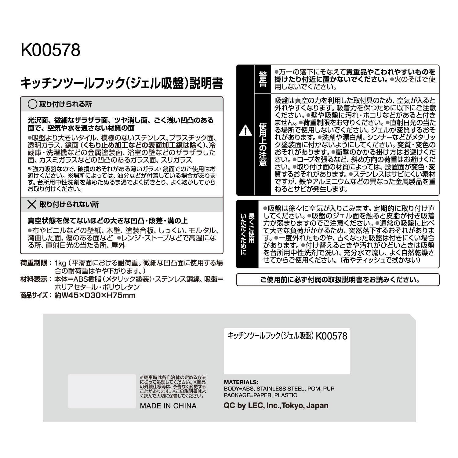 レック キッチン ツールフック (ジェル吸盤) 1個入 耐荷重1kg サイズ約45×30×75mm
