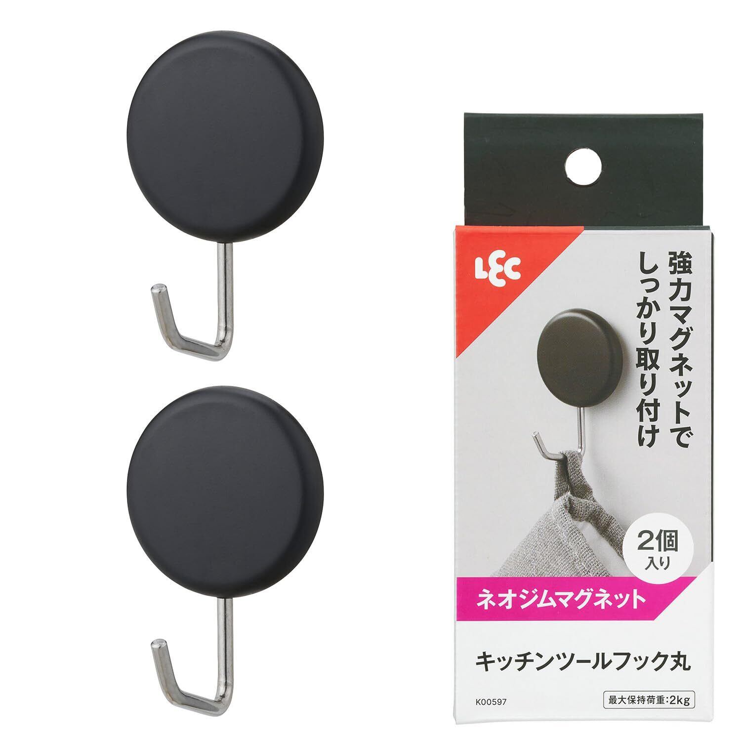 レック キッチン ツールフック 丸 ブラック (強力マグネット) 2個入 耐荷重2kg サイズ約40×35×60mm