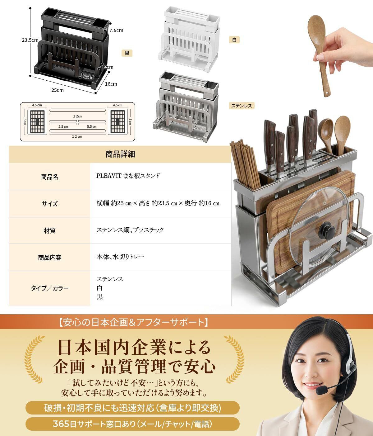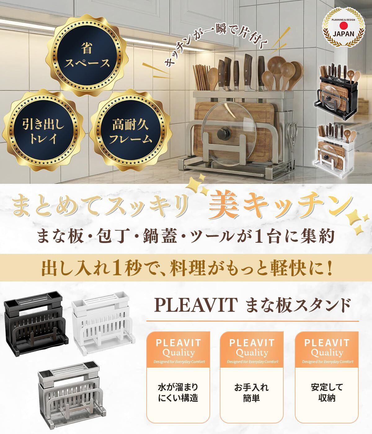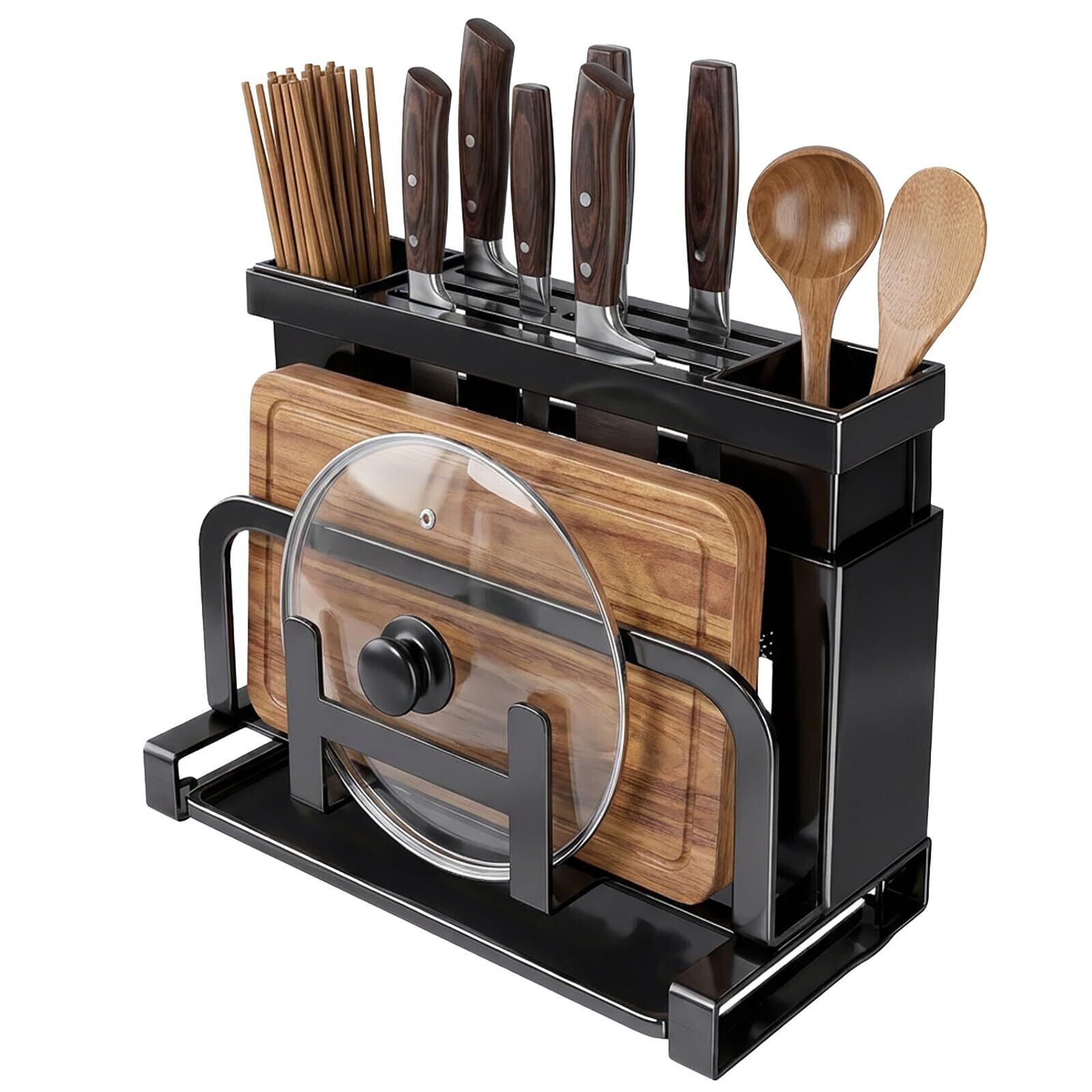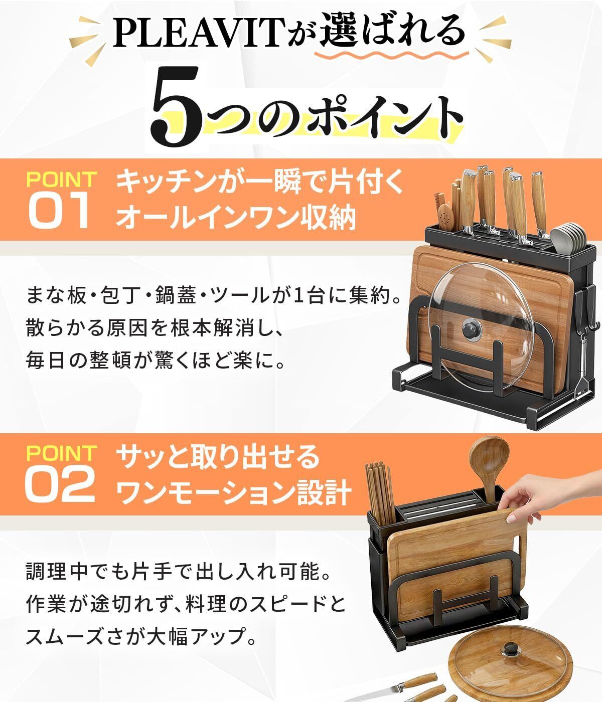 PLEAVIT まな板スタンド 包丁立て 鍋蓋スタンド お箸立て キッチン用収納ラック 多機能 水切りトレイ付 黒