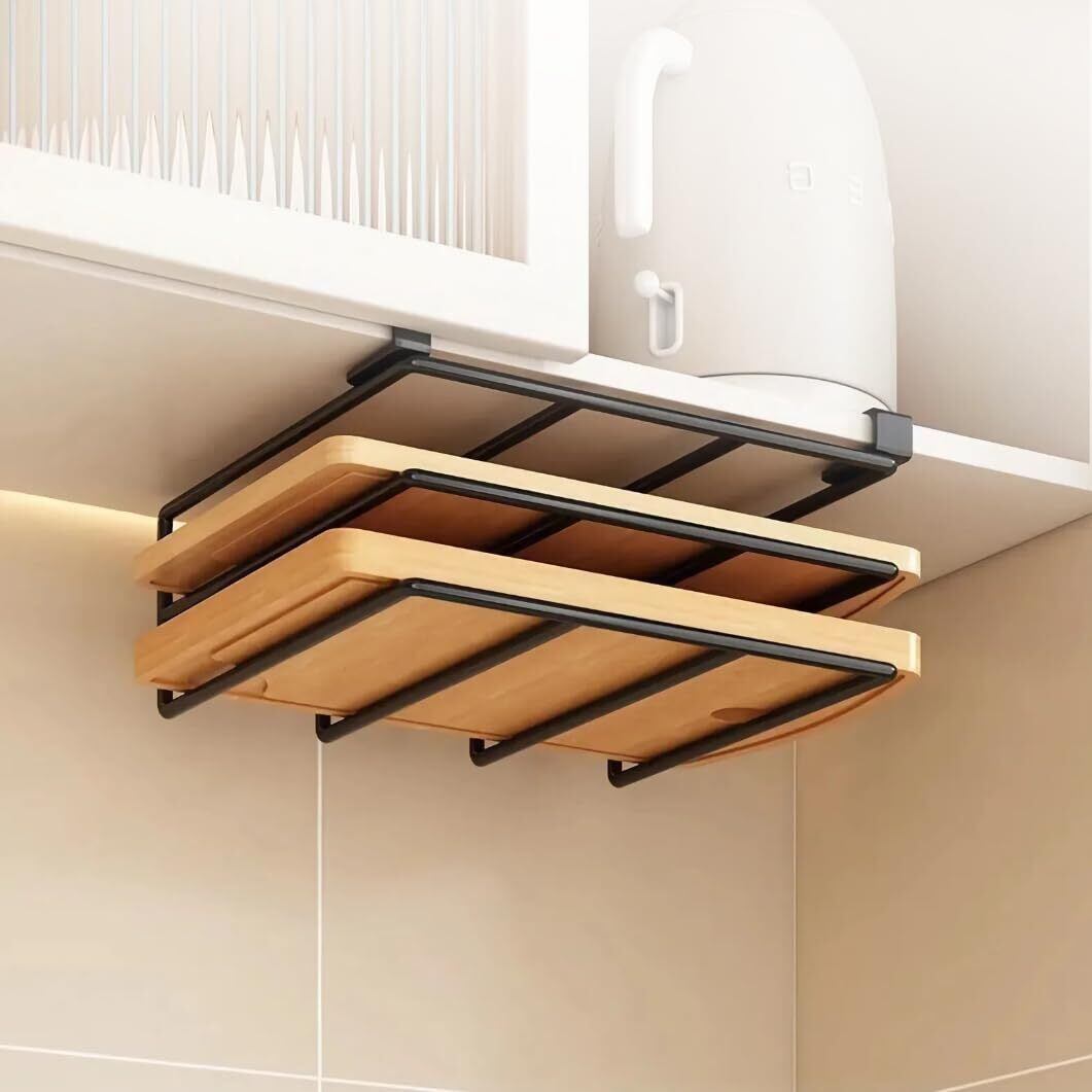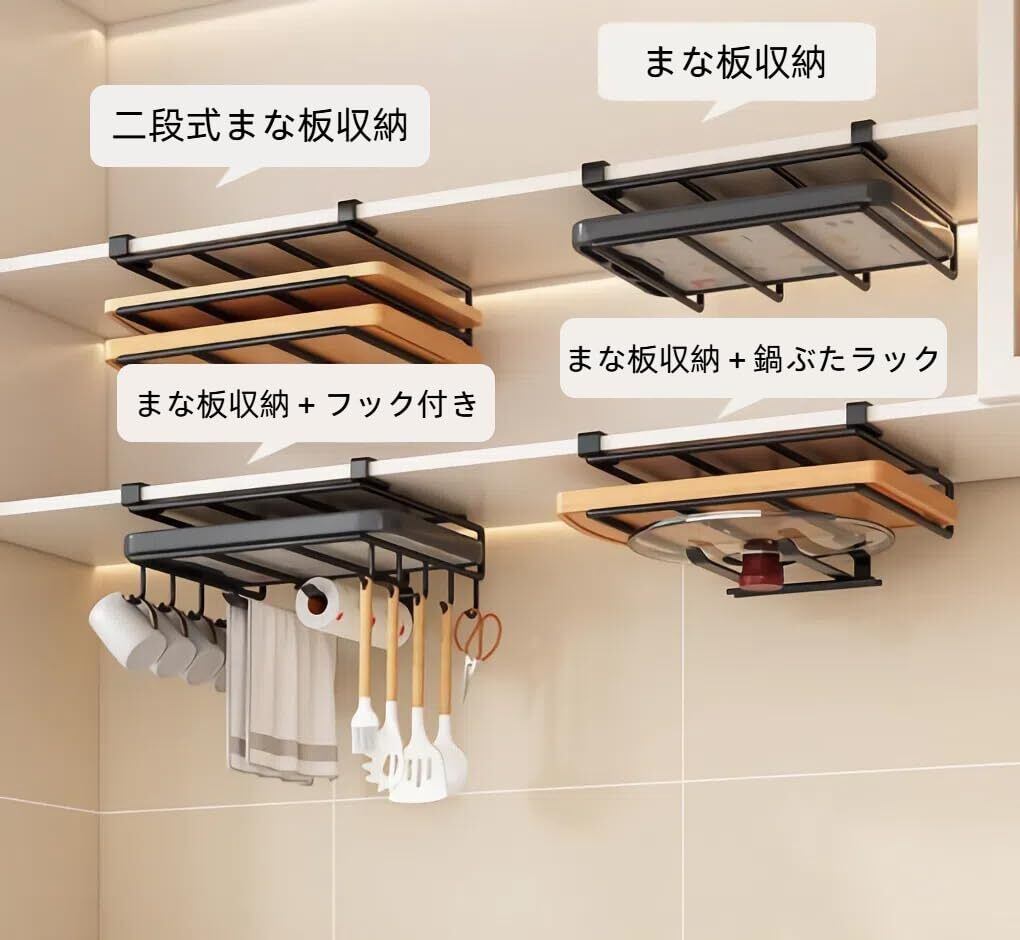 戸棚下まな板ホルダー まな板 キッチン収納 吊り下げラック 調理器具収納 省スペース フック付き 布巾ハンガー キッチンペーパーホルダー 錆びにくい 取り付け簡単 ブラック (二段式まな板収納)