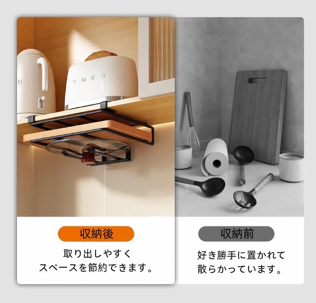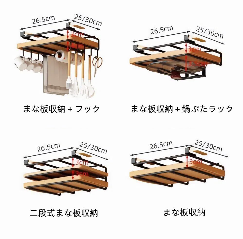 【商品仕様】長さ26.5cm×奥行25/30cm 2.5cm以下のまな板にご使用いただけます。4つのタイプ:①まな板収納+フック②まな板収納+鍋ぶたラック③二段式まな板収納④まな板収納
