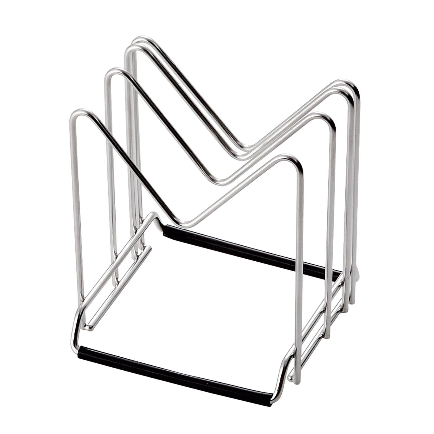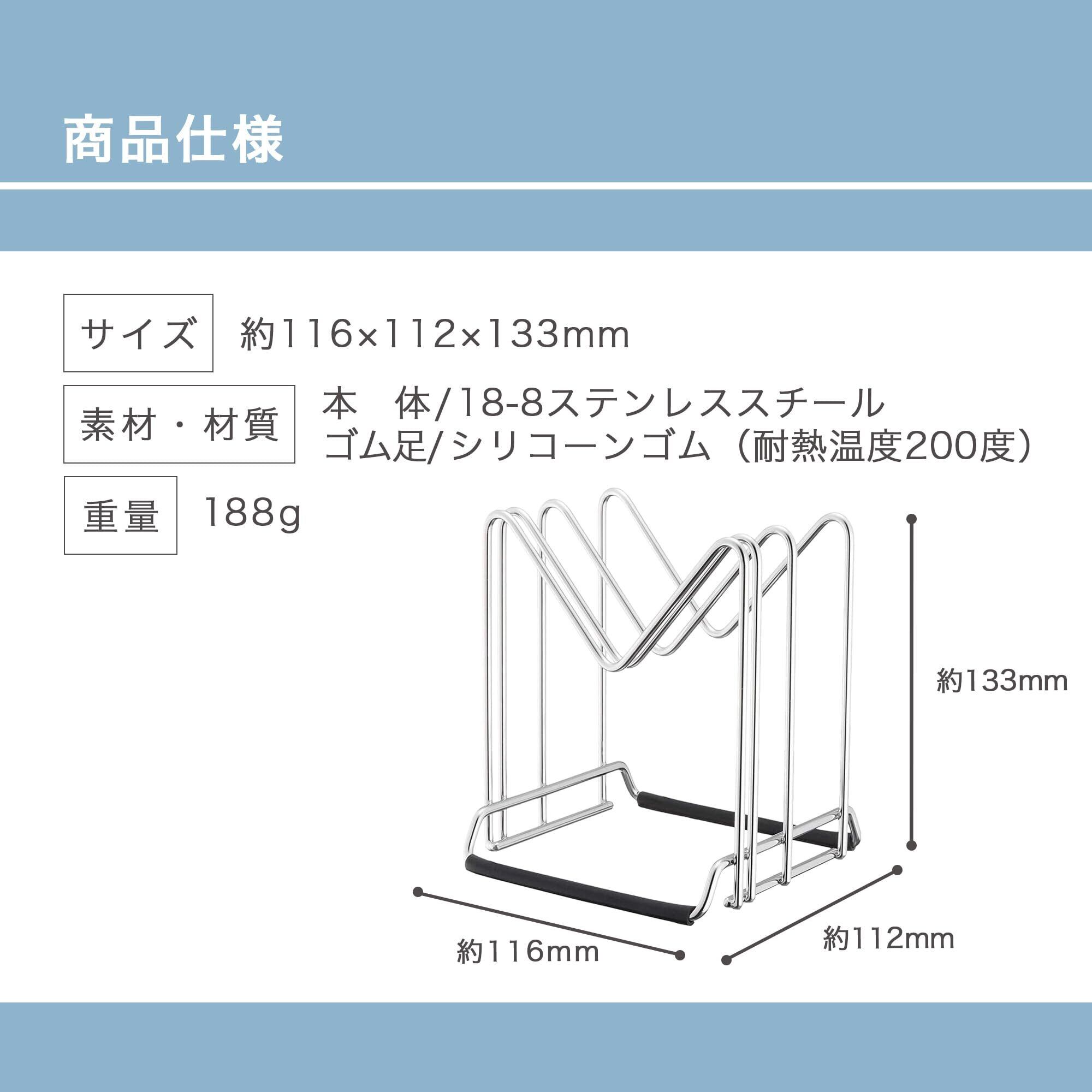 ●【商品説明】●シート、木製まな板や鍋蓋が収納できるスタンドです。●ゴム足が付いているので安定して置けるスタンド●シンクをキズつけません。●【原材料】●本体・・・18-8ステンレススチールゴム足・・・シリコーンゴム(耐熱温度200度)●【規格概要】●本体サイズ・・・約幅11.2*縦11.6*高さ13.3cm