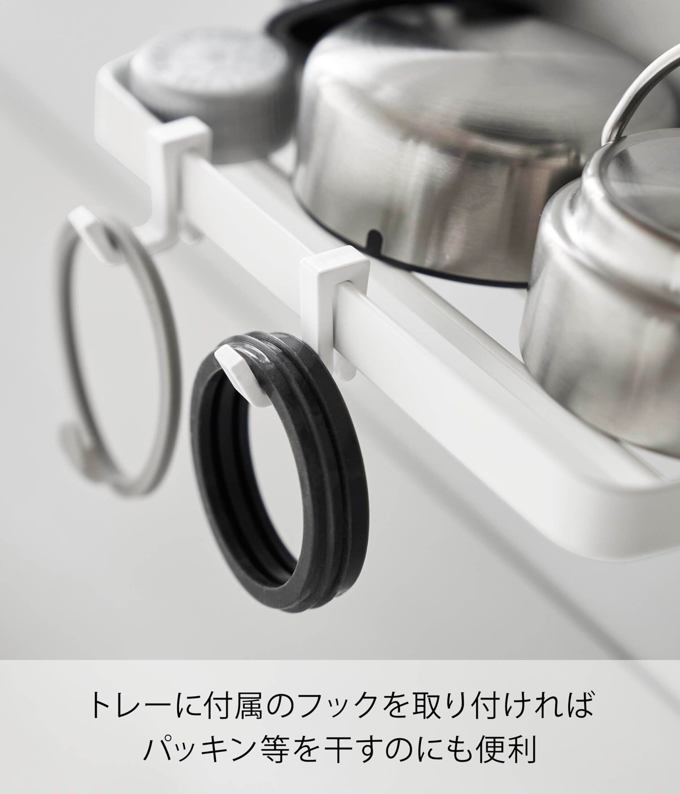トレーに付属のフックを取り付ければパッキン等を干すのにも便利です。