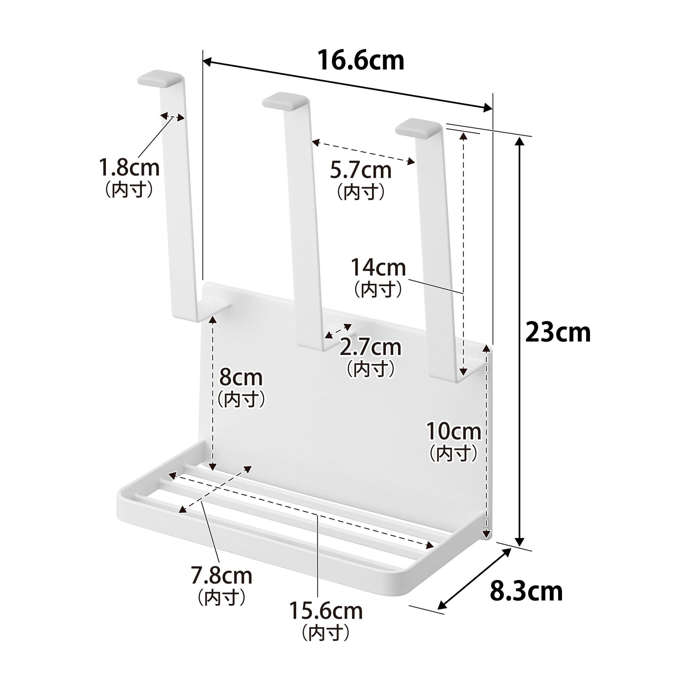 マグネットで簡単に取り付けることができる。 トレー付きのボトルホルダー。 ■サイズ:W16.6cm×D8.3cm×H23cm ■素材: 本体/スチール ( ユニクロメッキ+粉体塗装 ) 、マグネット 滑り止め、キャップ/シリコーン ■付属品:フック×2 ■内寸: ホルダー部/W1.8cm×D2.7cm×H14cm ( 1つあたり ) ホルダー同士の間隔:5.7cm トレー部/W15.6cm×D7.8cm×H8cm ( ホルダー部との間隔 ) cm ■耐荷重: ホルダー1つあたり/500g トレー部/500g フック1つあたり/250g ( 静止荷重 )