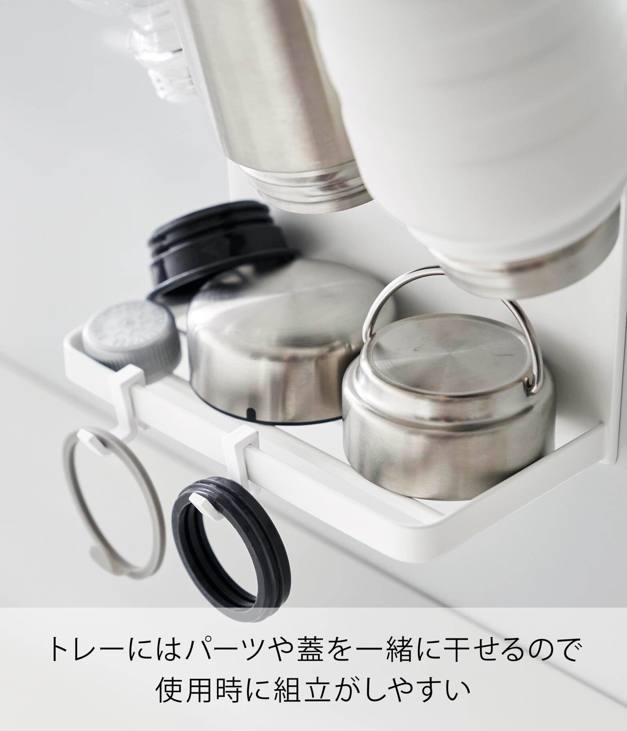 ■使用できる面:マグネットがつく平らな面・スチール面 ■特徴: マグネットがつくスチール面に簡単取り付け。 マグボトルやペットボトル、哺乳瓶なんどの付属品も一緒に干すことができます。 トレーに付属のフックを取り付ければパッキンなどを干すのにも便利です。 ホルダーにはシリコーンキャップが付いているのでマグボトルなどの内部をキズつけません。
