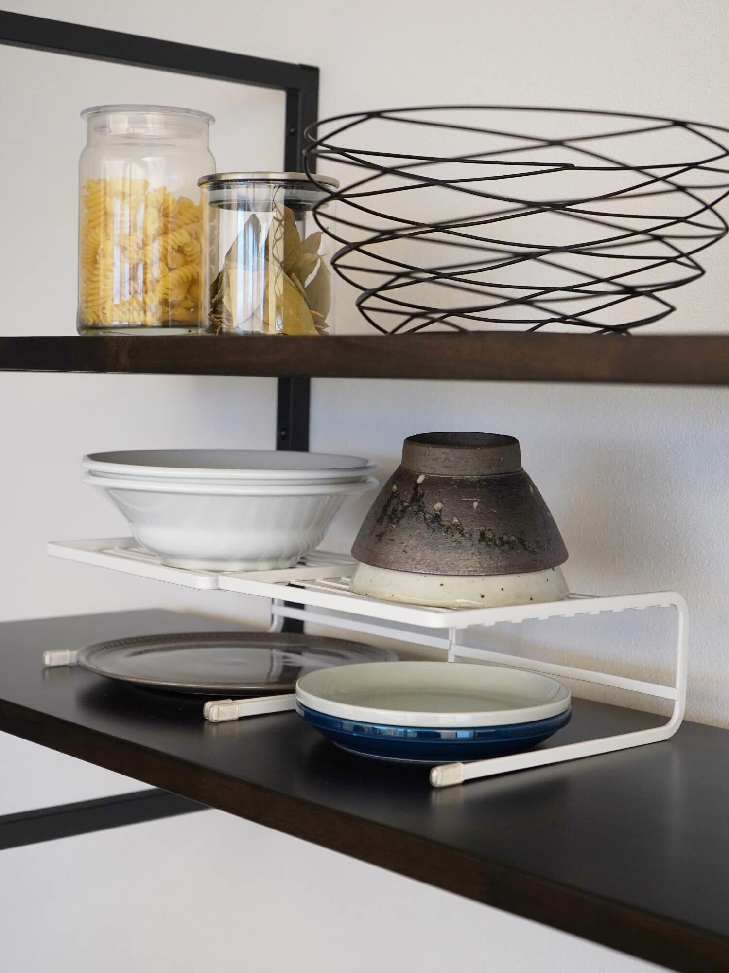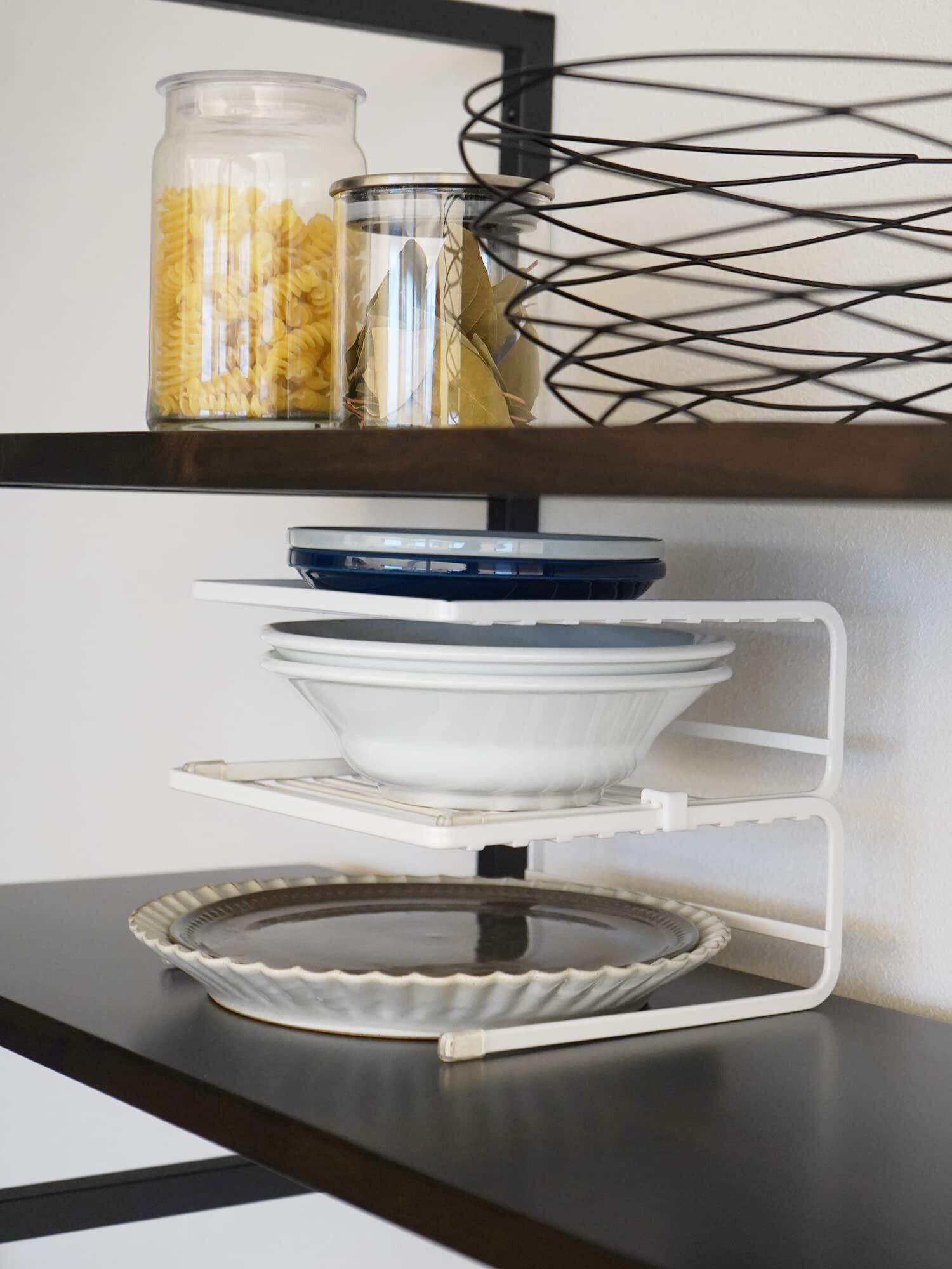 ●食器棚のスペースを有効に利用できます。●接地面を傷つけにくいカバー付。●積み重ね時、ずれにくい連結パーツ付。●耐荷重各2 kg、積み重ね時は全体で 2 kg