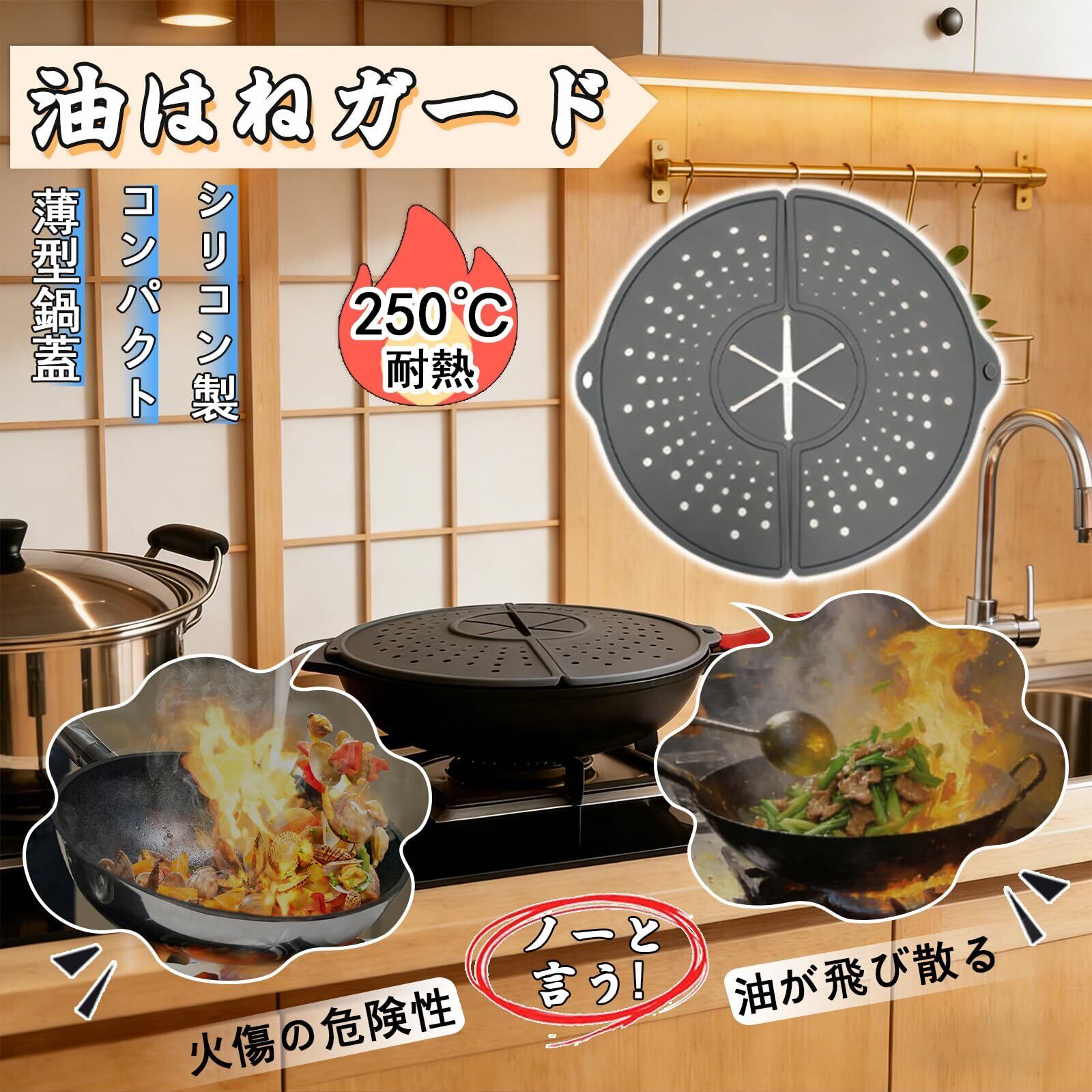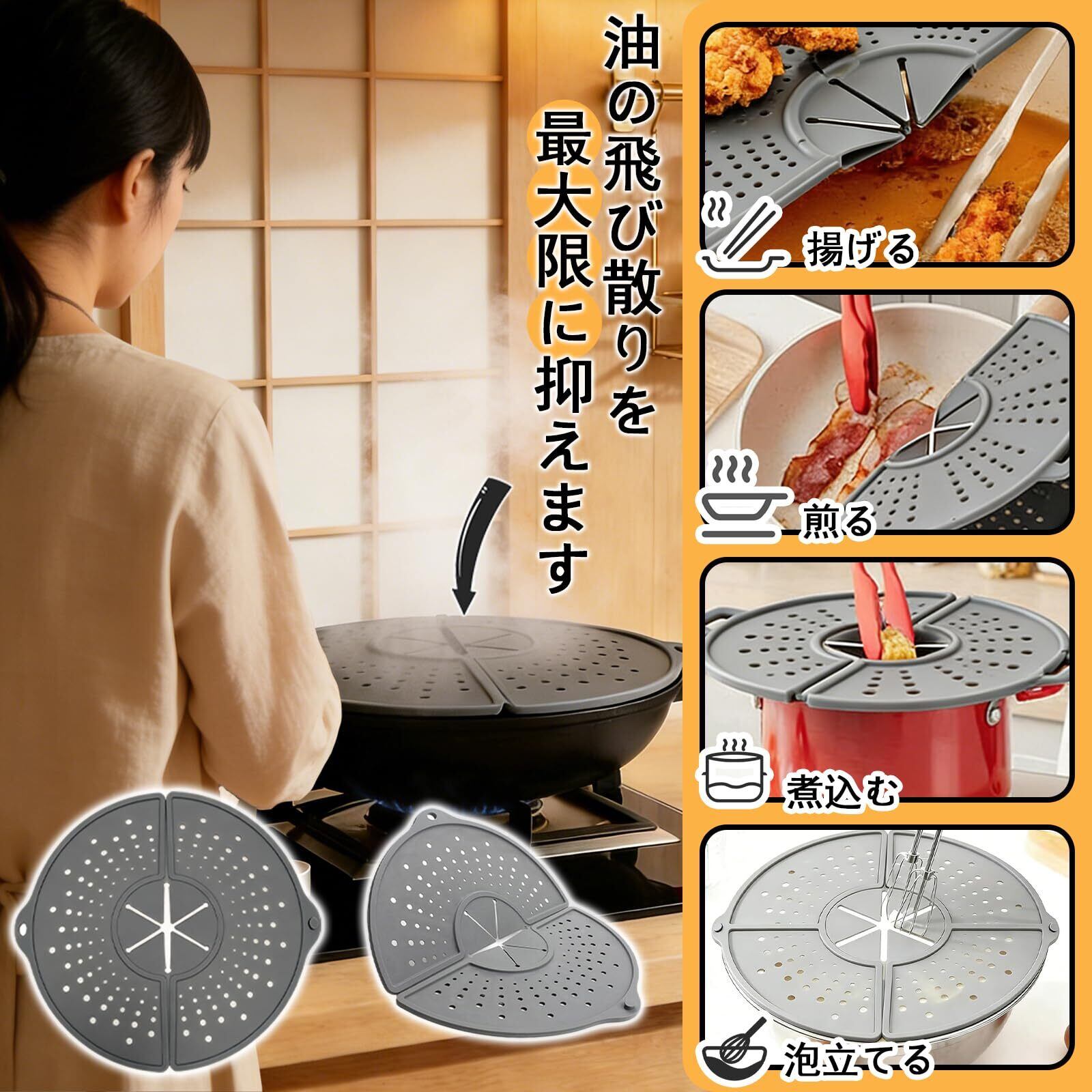 【コンパクト収納・多機能で便利】 折りたたんで隙間や引き出しに収納可能。食洗機対応でお手入れ簡単。油はねガードだけでなく、鍋敷き・蒸しマットとしても使え、毎日の家事を効率化します。
