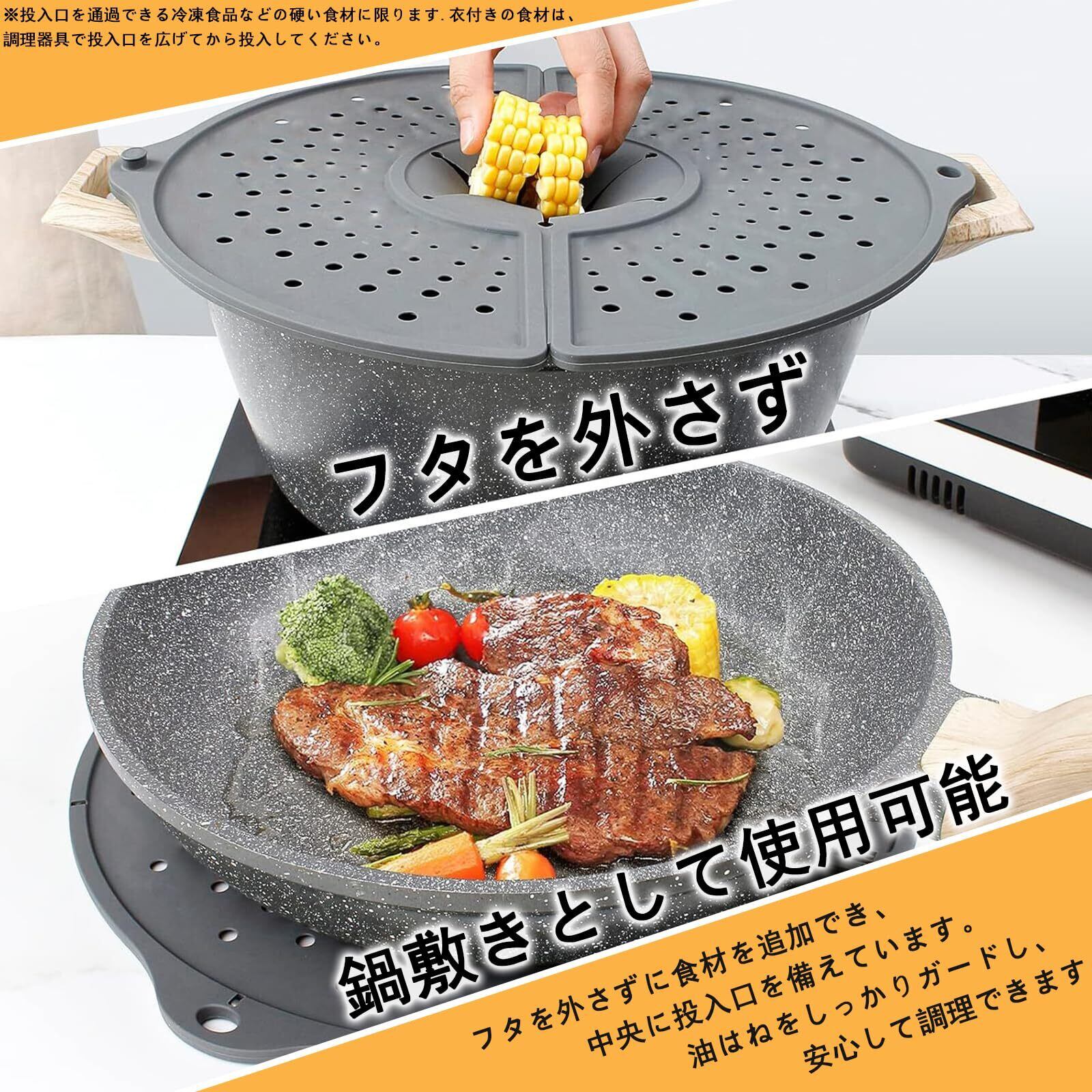 【センタースリット付きで使いやすい】 中央のすき間から箸や泡立て器を差し込んで、そのまま調理可能。半開き折りたたみ構造で、全て外さずに味付け・焼き色確認ができ、油はね防止も持続します。