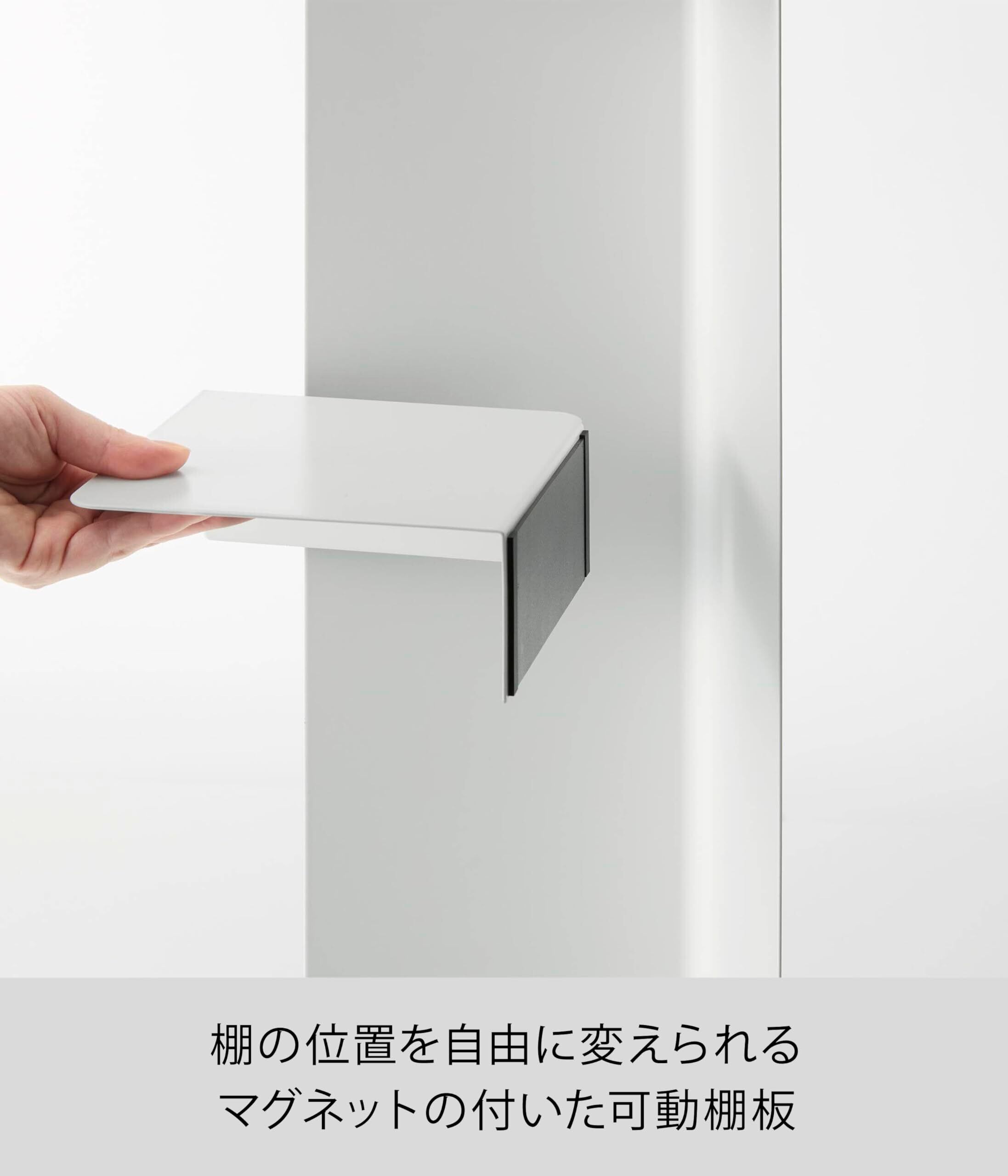 マグネット付きの棚板は高さを自由に変えられ、長いトイレブラシも収納可能。