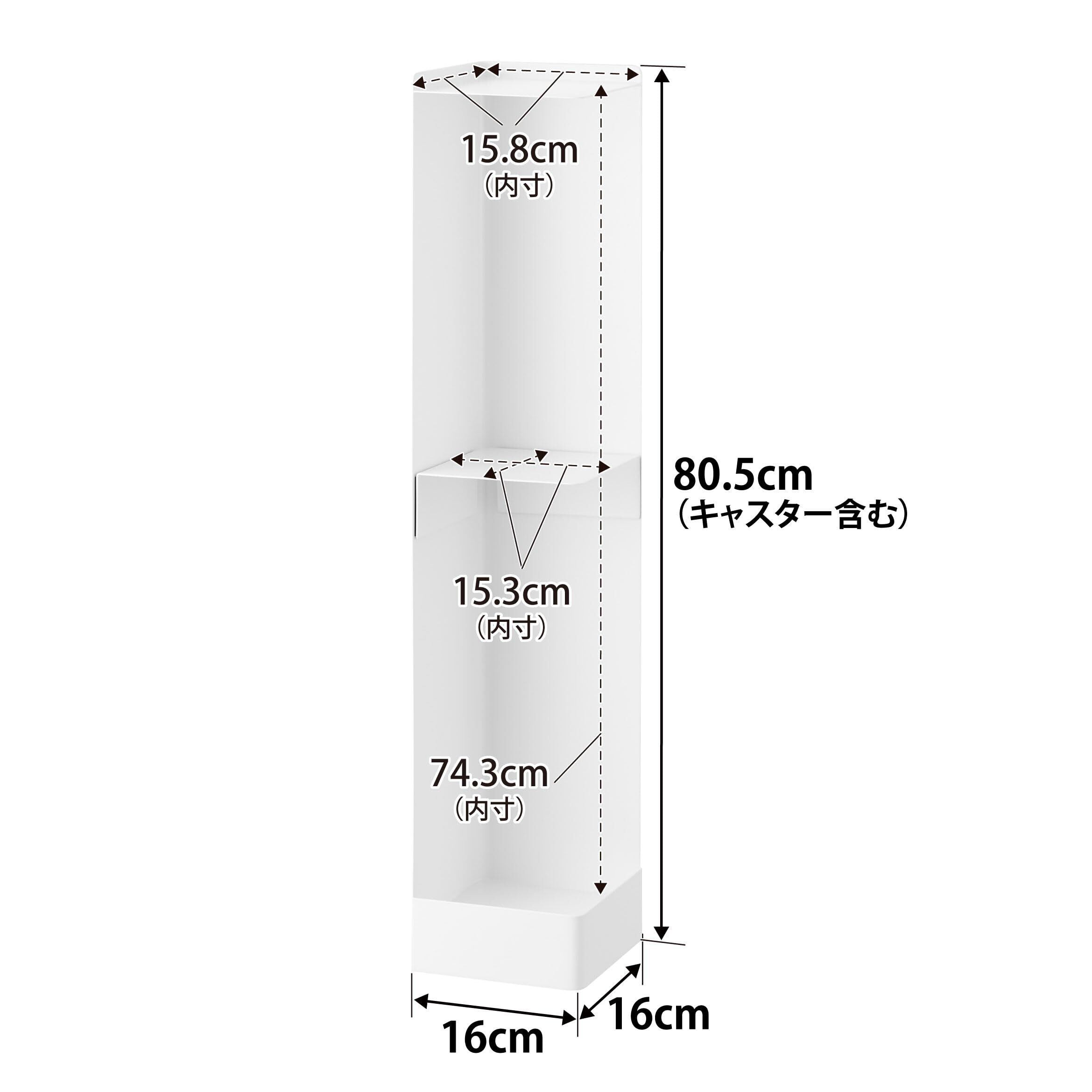 トイレ用品を隠して収納できるスリムトイレラック トイレ用品を隠して収納できるキャスター付きスリムトイレラックです。狭いスペースでクルっと回転できます。移動がスムーズなキャスター付きで掃除もしやすく、外からは見えないスッキリしたデザインです。マグネット付きの棚板は高さを自由に変えられ、長いトイレブラシも収納可能。棚板の荷重600gまで。 ■サイズ:幅/16cm x 奥行き/16cm x 高さ/80.5cm(キャスター含む)