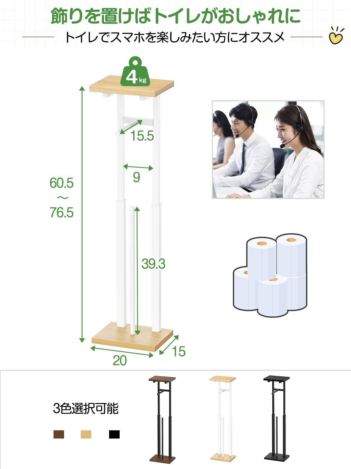 TTWO トイレ収納棚 トイレットペーパーホルダー 幅20×奥行15×高さ60.5-76.5cm 高さ3段階調節 スリム ペーパースタンド スマホ・芳香剤置き トイレラック コーナー 隙間 ストッカー 洗面所 玄関収納 便利 省スペース 薄型 サニタリーラック おしゃれ (ナチュラル)