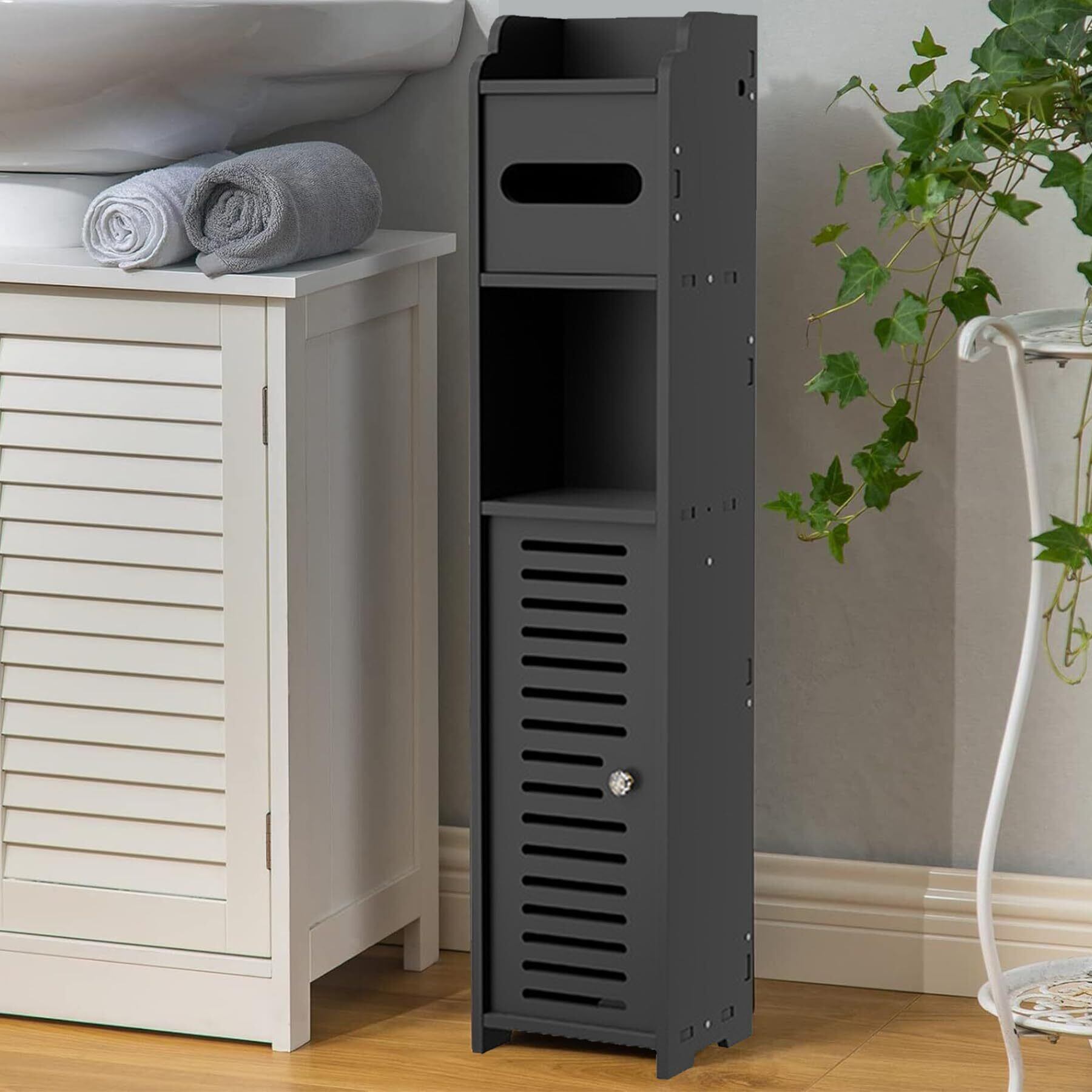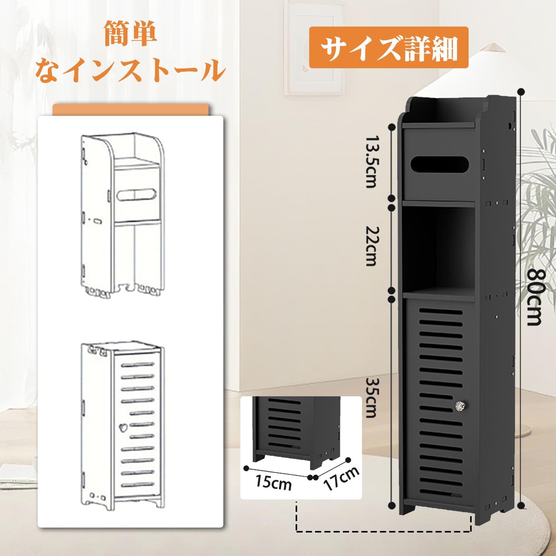 トイレ 収納 隙間収納 スリム 収納 防水 防湿 組立簡単 玄関/洗面所/寝室/書斎 省スペース バスルーム収納棚 (ブラック, 15*17*80cm(片開きドア))