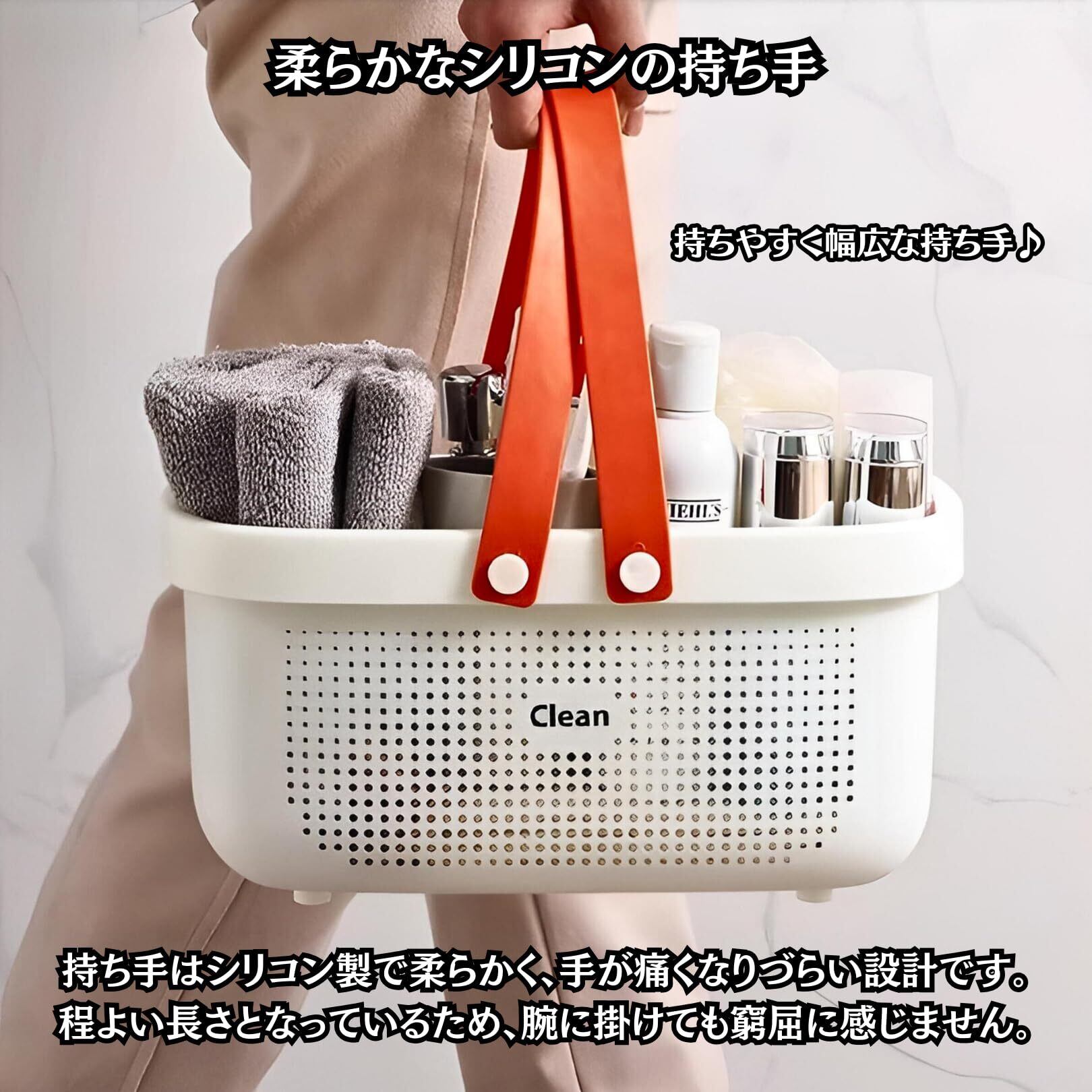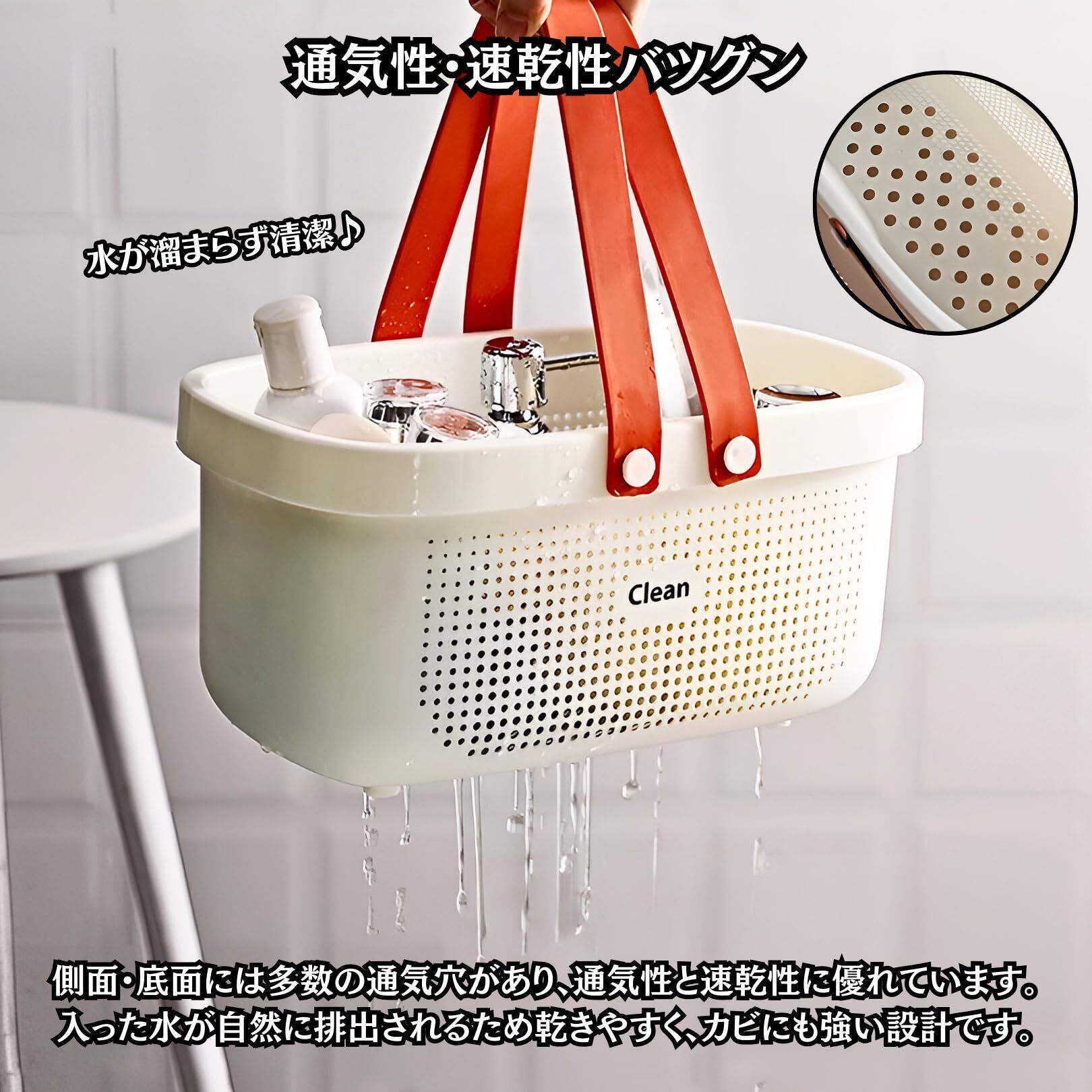 【通気性・速乾性◎】側面・底面部分に多数の通気穴がある設計で、通気性と速乾性に優れています。バスケットを持ち上げると自然に水が排出されるので乾きやすく、カビの発生も防止できるため清潔に保つことができます。