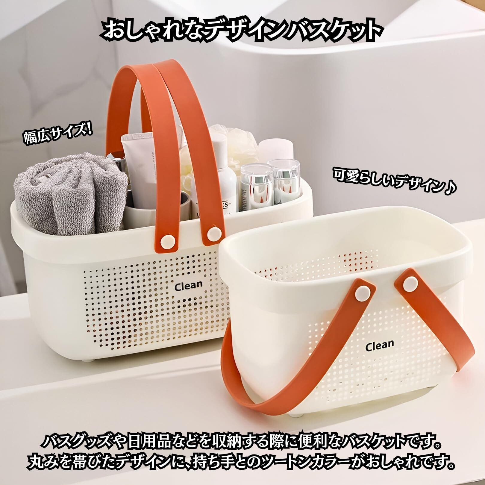 【おしゃれなデザインバスケット】バスグッズ・日用品・化粧品・衣類などを収納する際に便利なバスケットです。丸みを帯びた可愛らしいデザインで、持ち手部分は本体とは異なる色のおしゃれなツートンカラーとなっております。