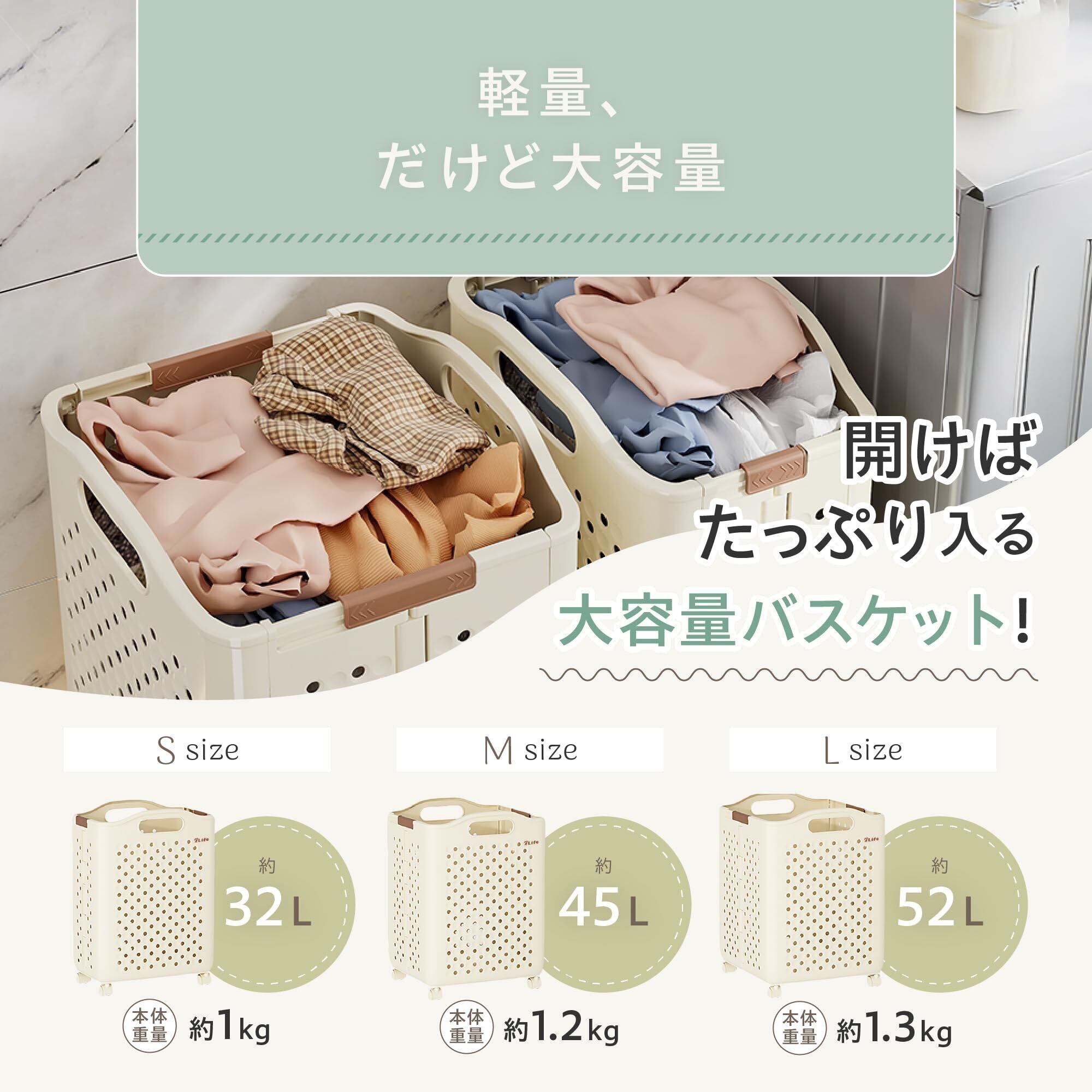 【折り畳み式&組み立て簡単】収納時はわずか10cmの薄さで折りたため、スペースを広々と活用できます。洗面所やランドリールームにぴったりの収納デザインで、必要な時には大容量のバスケットとして活躍します。 S(32L)、M(45L)、L(52L)の3サイズ展開で、どんな家庭や生活スタイルにもフィット。コンパクトさ(小型)と大容量を両立した便利なアイテムは、日常の洗濯をもっと快適にサポートします。