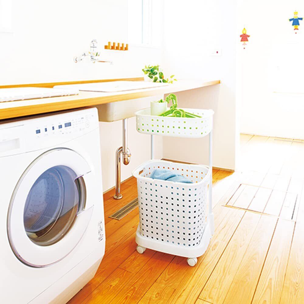 上段にはタオルや着替え、下段は脱衣カゴとして使用するなど、上下で使い分けできます。洗濯物の分別に使えば仕分けの手間が省けて時短に。下段のバスケットは大容量の深型タイプ。洗濯物干し場までの移動に便利なハンドル付き。安心の日本製。