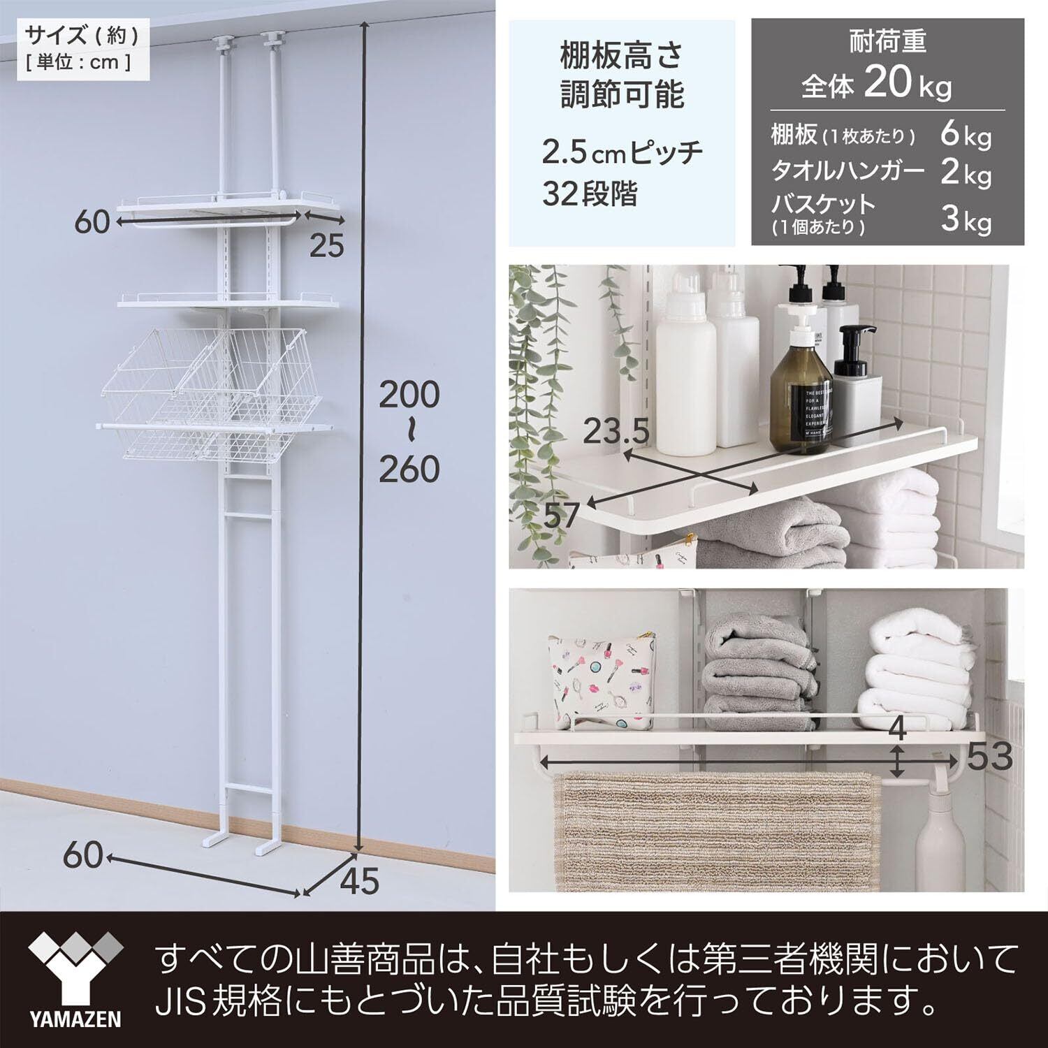 山善(YAMAZEN) 突っ張り ラック ランドリーラック 洗濯機ラック バスケット付き 床置き 洗濯パン対応 棚板高さ調節 省スペース 幅60×奥行45×高さ200-260cm 棚 収納 洗面所 脱衣所 組立品 ホワイト/マットホワイト RTLR-6040B(WH/MWH)