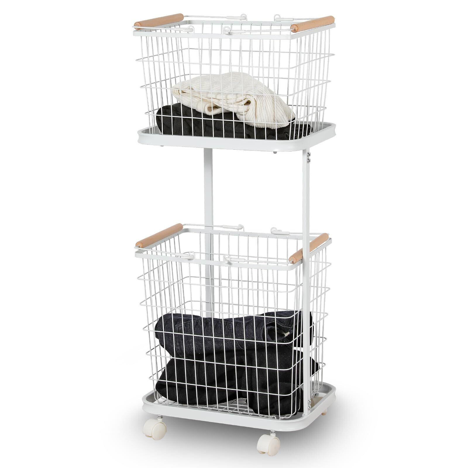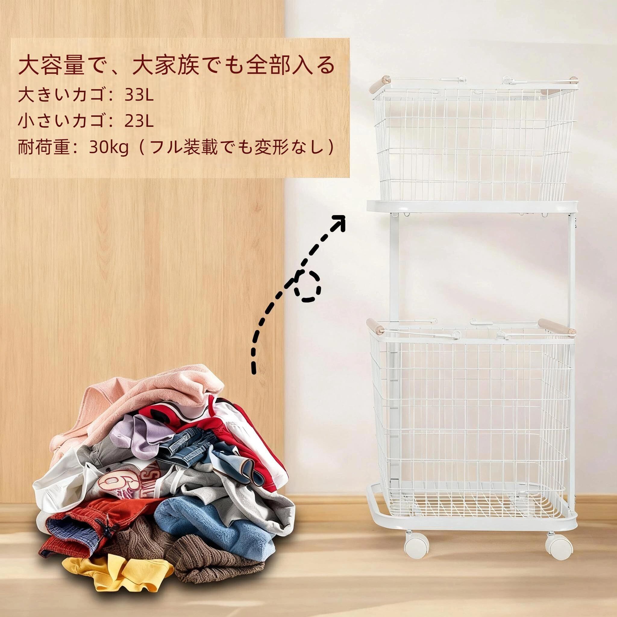 Saiveina 洗濯かご ランドリーバスケット 大容量 2段 洗濯物収納 ランドリー収納 キャスター付き 持ち手付き 収納ラック 取り外しバスケット 通気性いい ホワイト