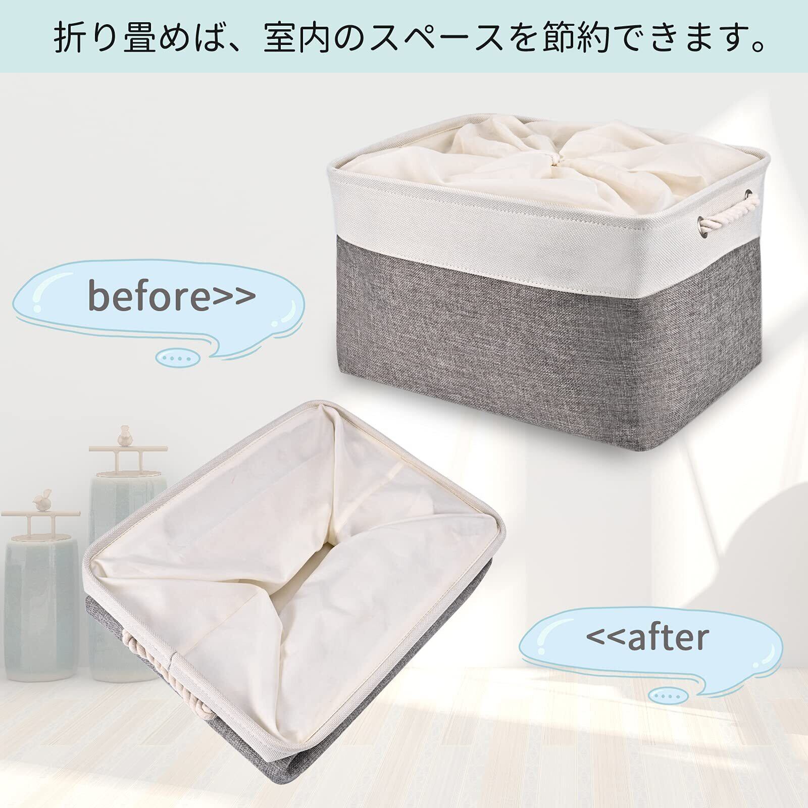 【軽量・折り畳む式】 収納バスケットは折りたたみ式ですからとても省スペースです。使用していないときは平らに折り畳むと簡単に保管できます。軽量ながらも非常に便利で実用的にデザインされています。