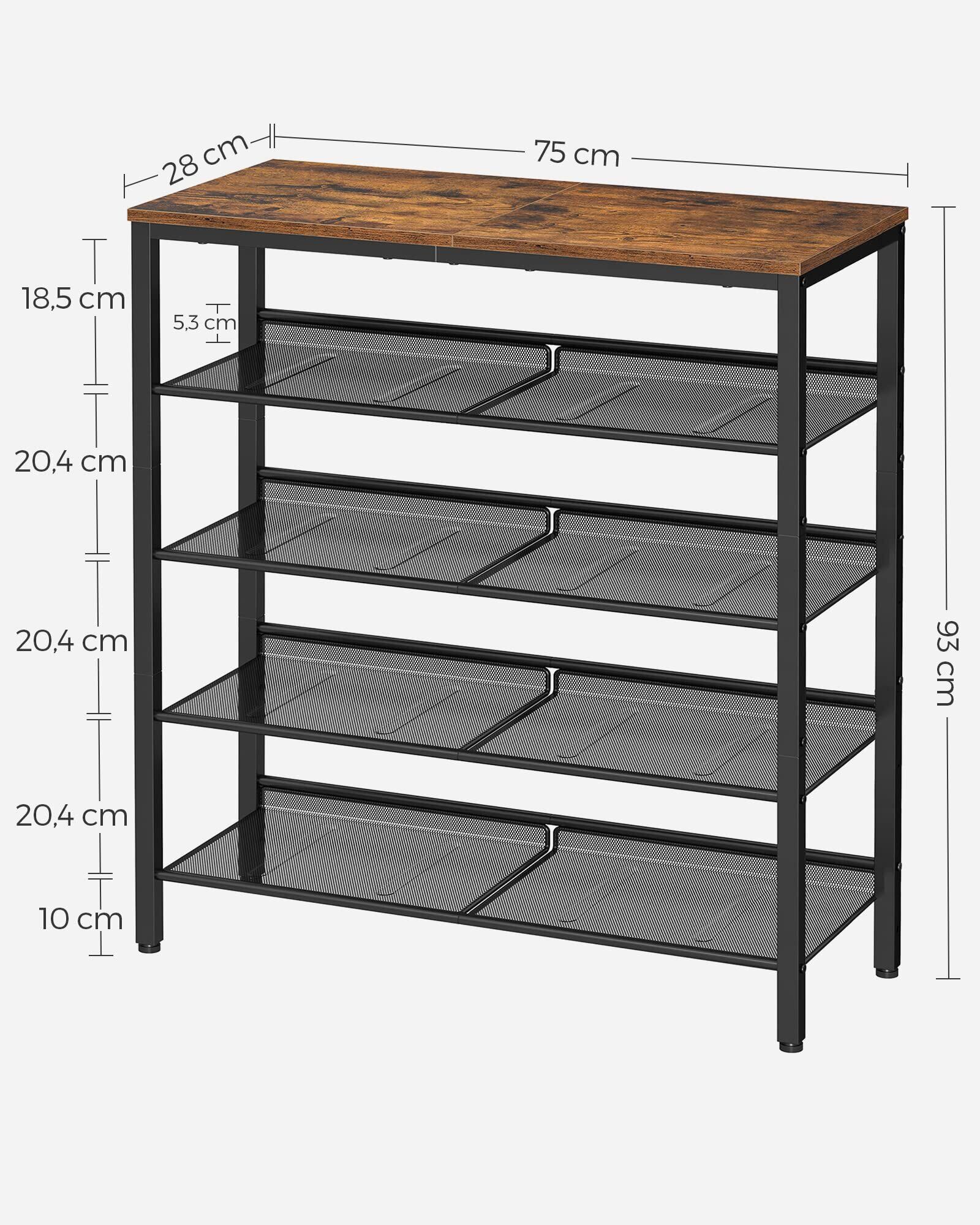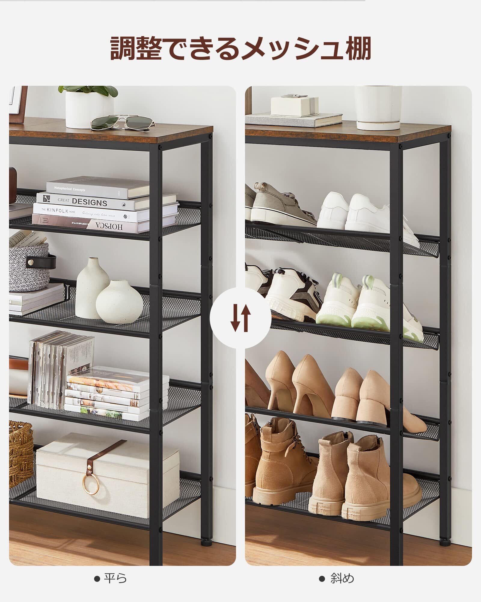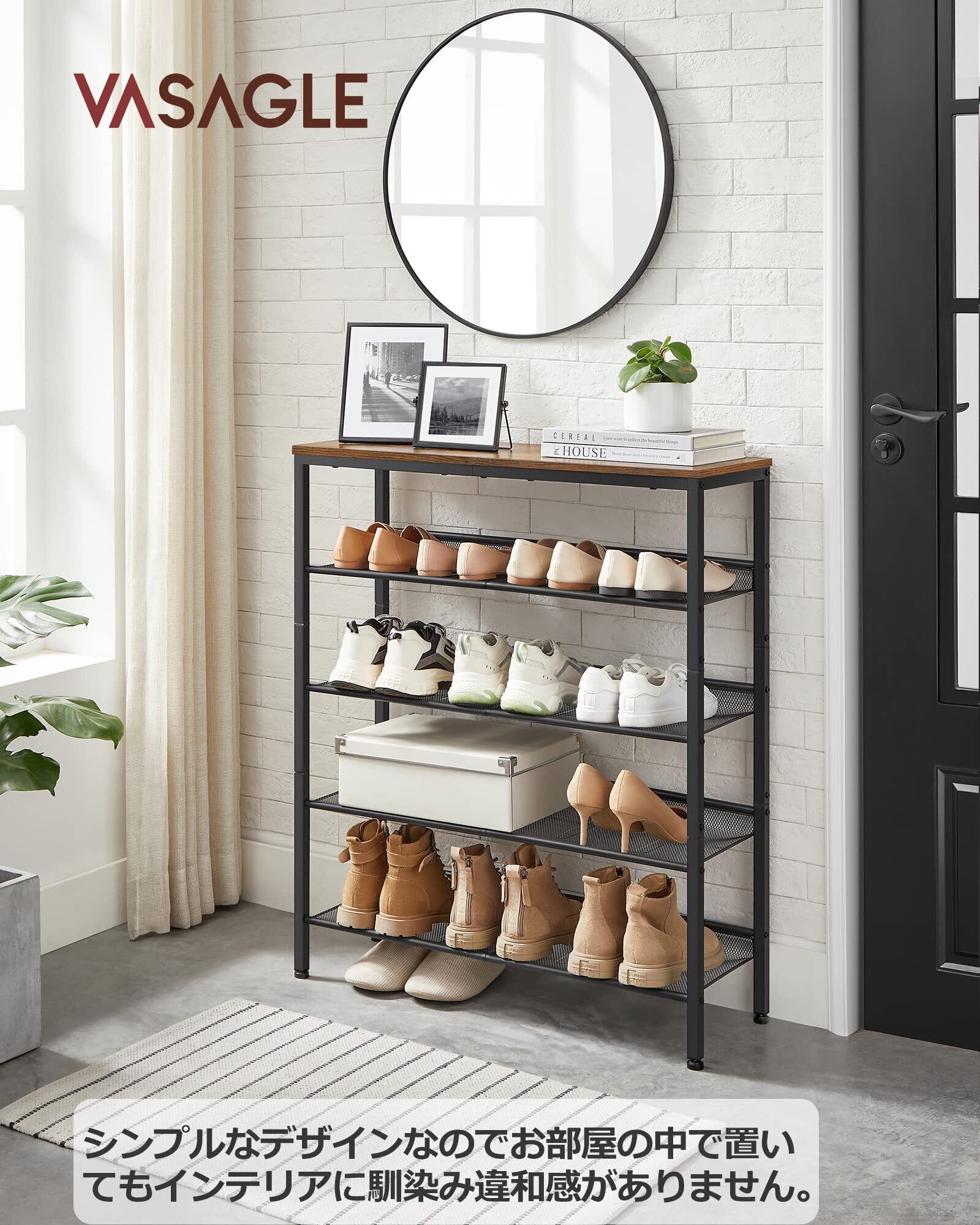 VASAGLE シューズラック 下駄箱 おしゃれ 省スペース 5段 大容量 木製 玄関収納 収納家具 シューズ 奥行28㎝ 高さ93㎝ メッシュ棚調整可能 ヴィンテージ 玄関 棚 靴収納 靴箱 通気性 ワイド オープン シンプル LBS038