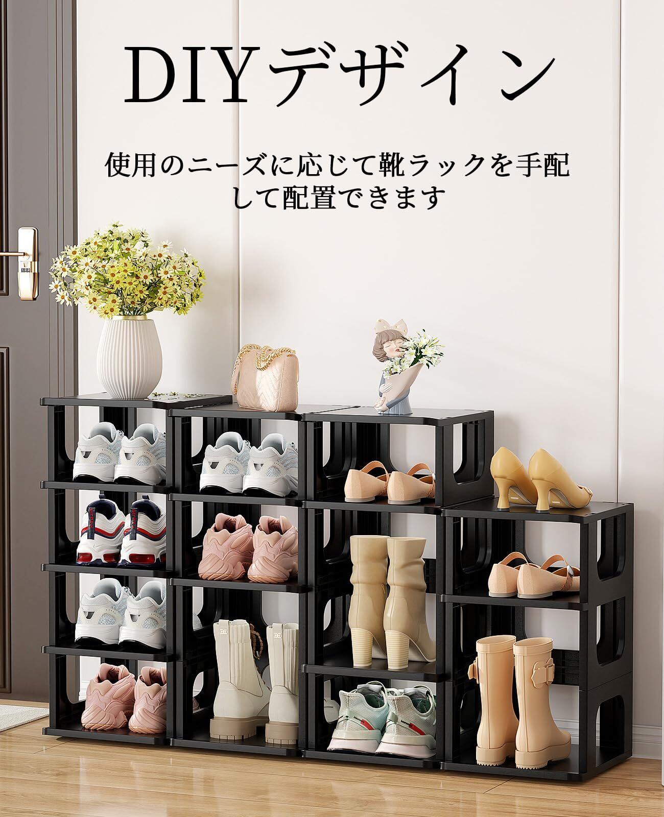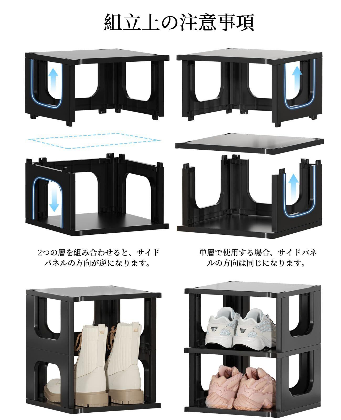 【組み立てやすい】シューズボックスのシンプルなモジュール化構造で、取り付けも簡単です。 シンプルで直感的なデザインにより、特別なツールやスキルを一切必要なく組み立てられます。 シューズホルダーの整理パーツは2種類の形で分類されたので、区別がしやすい。 U型パネルがすべてのパーツをうまく連結し、安定性を向上させます。