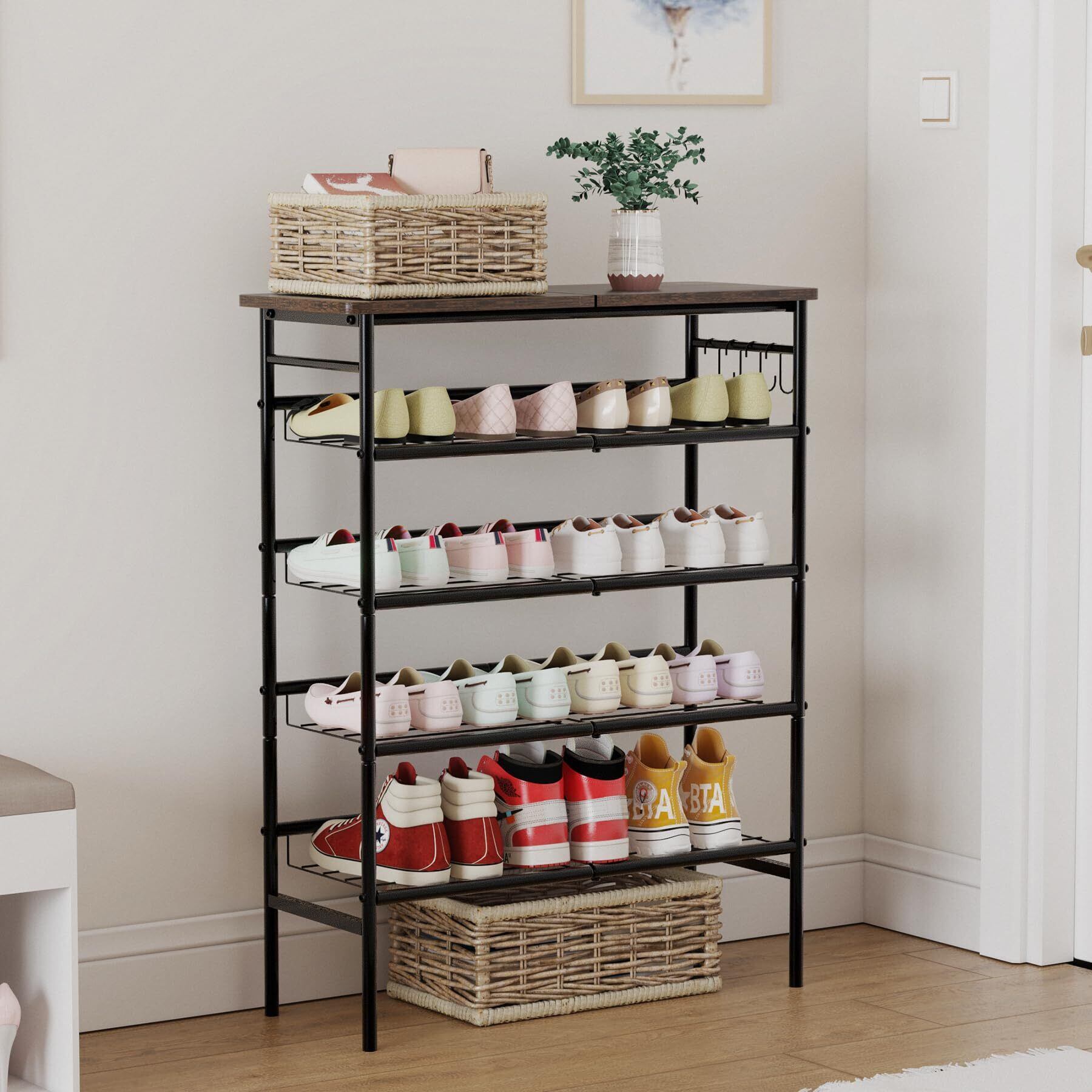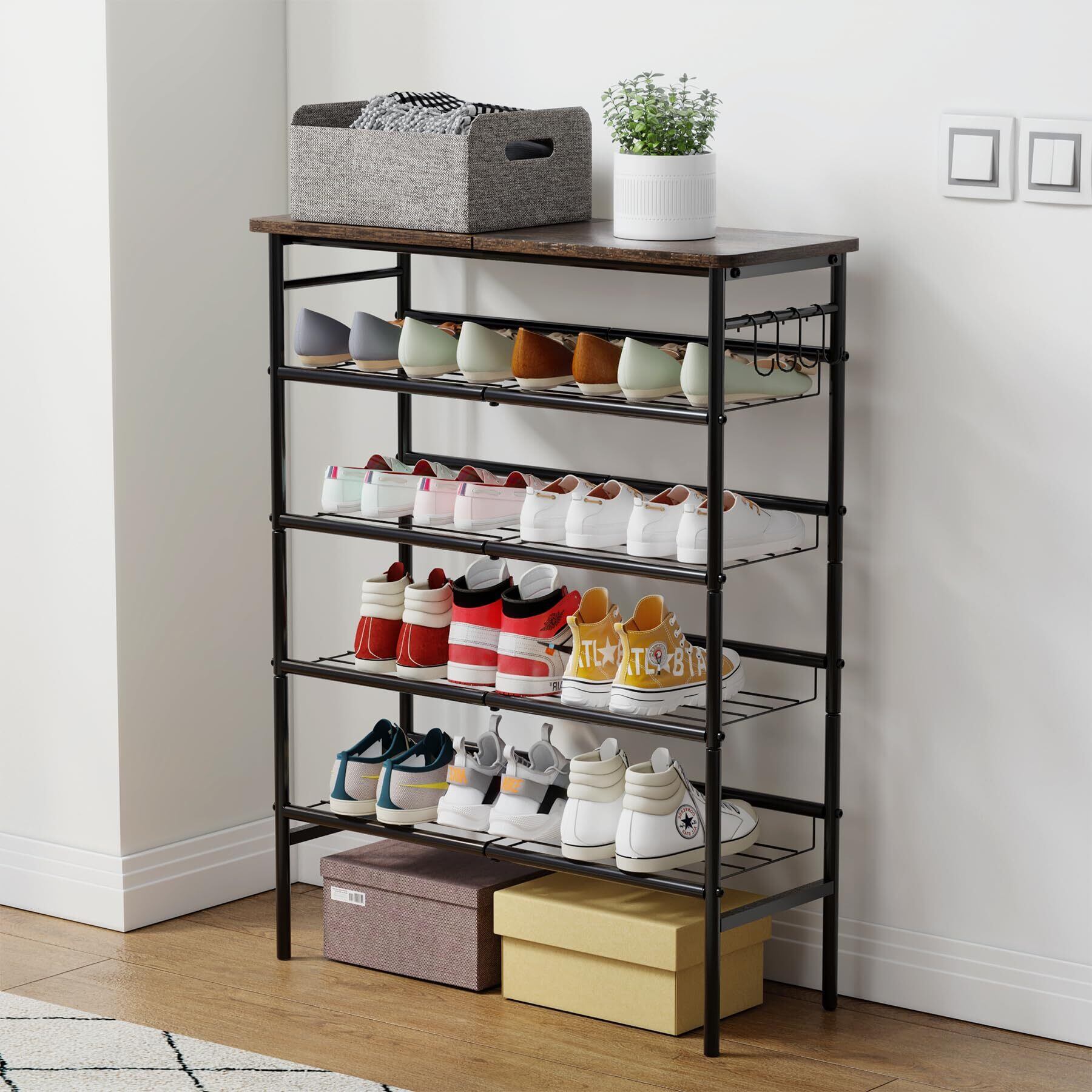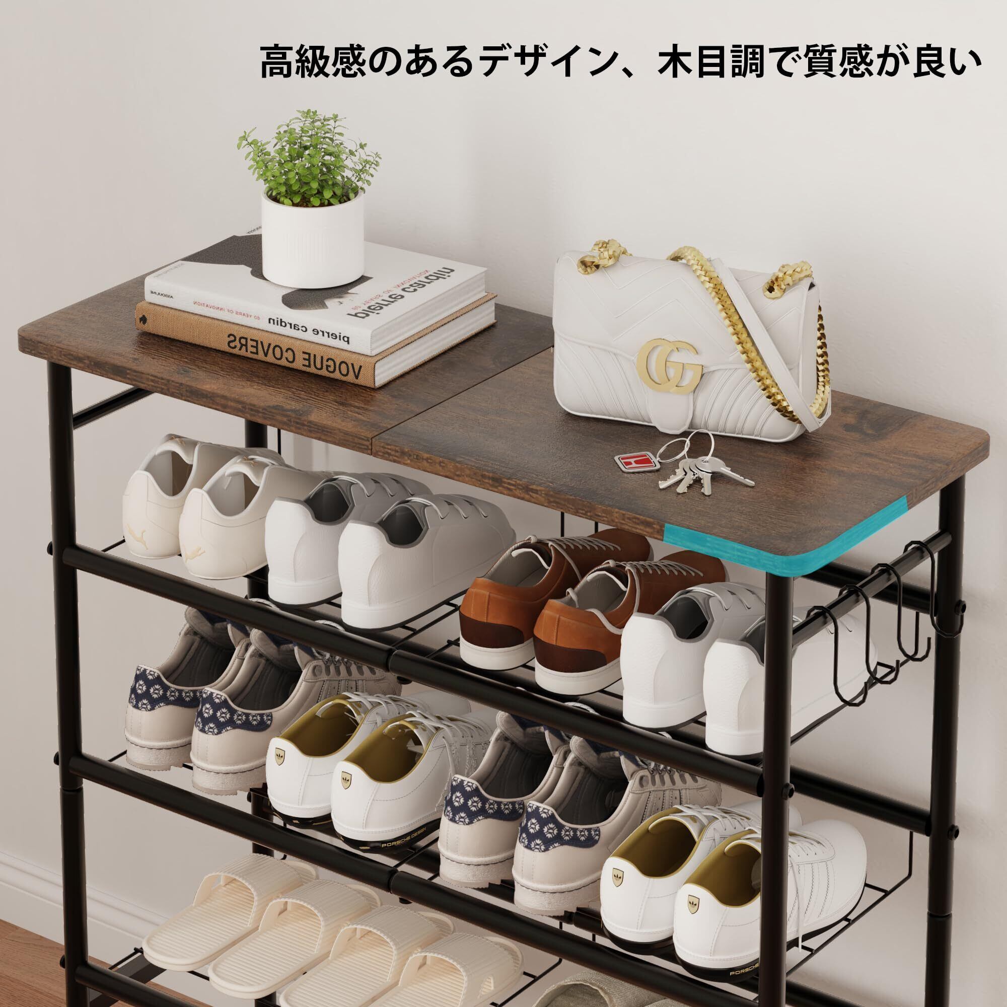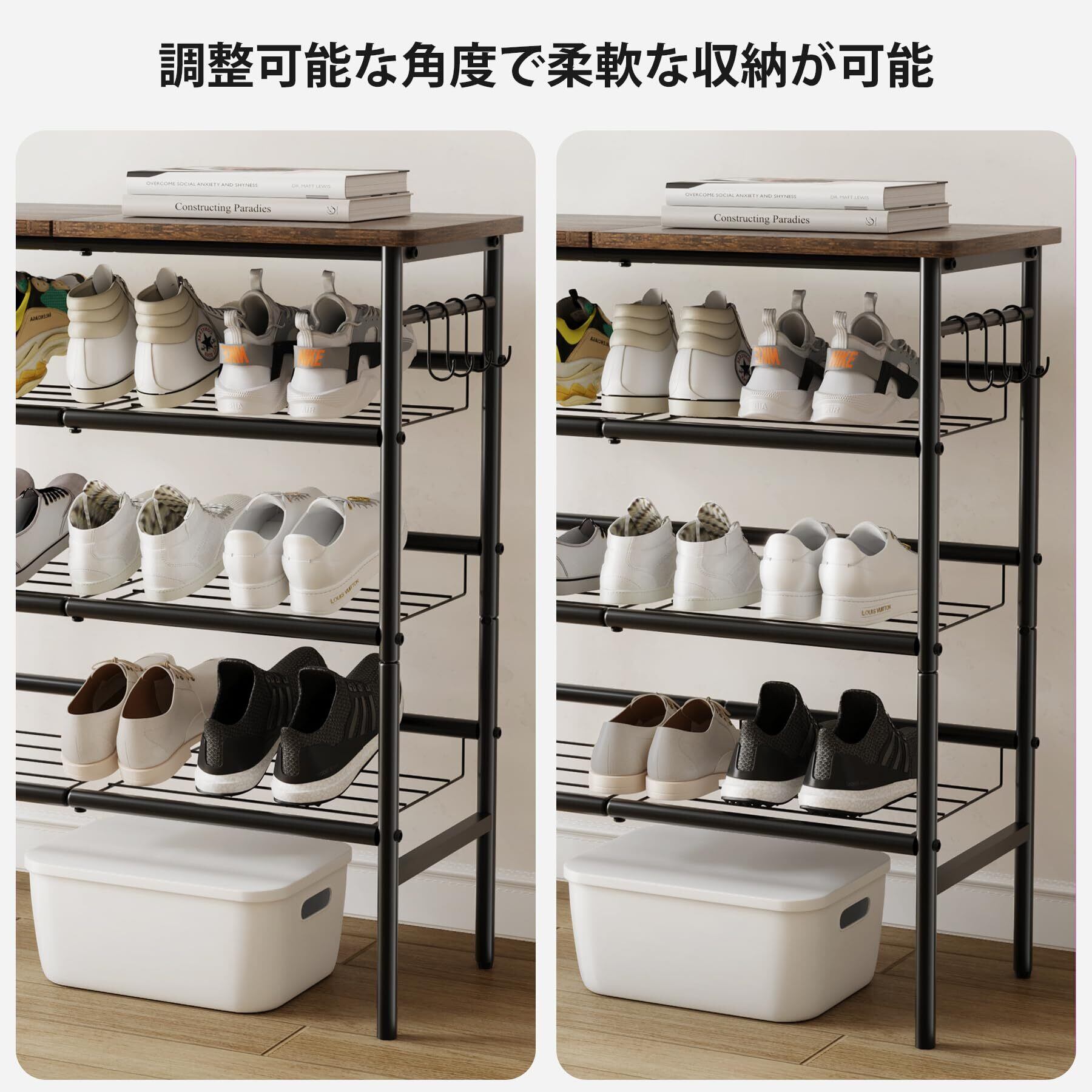 【調整可能な角度で柔軟な収納が可能】 スチール製の棚板は、靴の収納角度を自由に調整でき、天候や気分に合わせて最適な収納方法が選べます。シンプルな設計ながら、収納の自由度が高い点が特徴です。