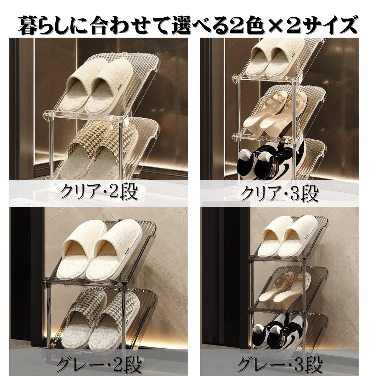 【選べるバリエーション】カラーはクリアとグレーの2色、段数は2段と3段から選べます。玄関の広さや靴の量に応じて柔軟に対応できます。