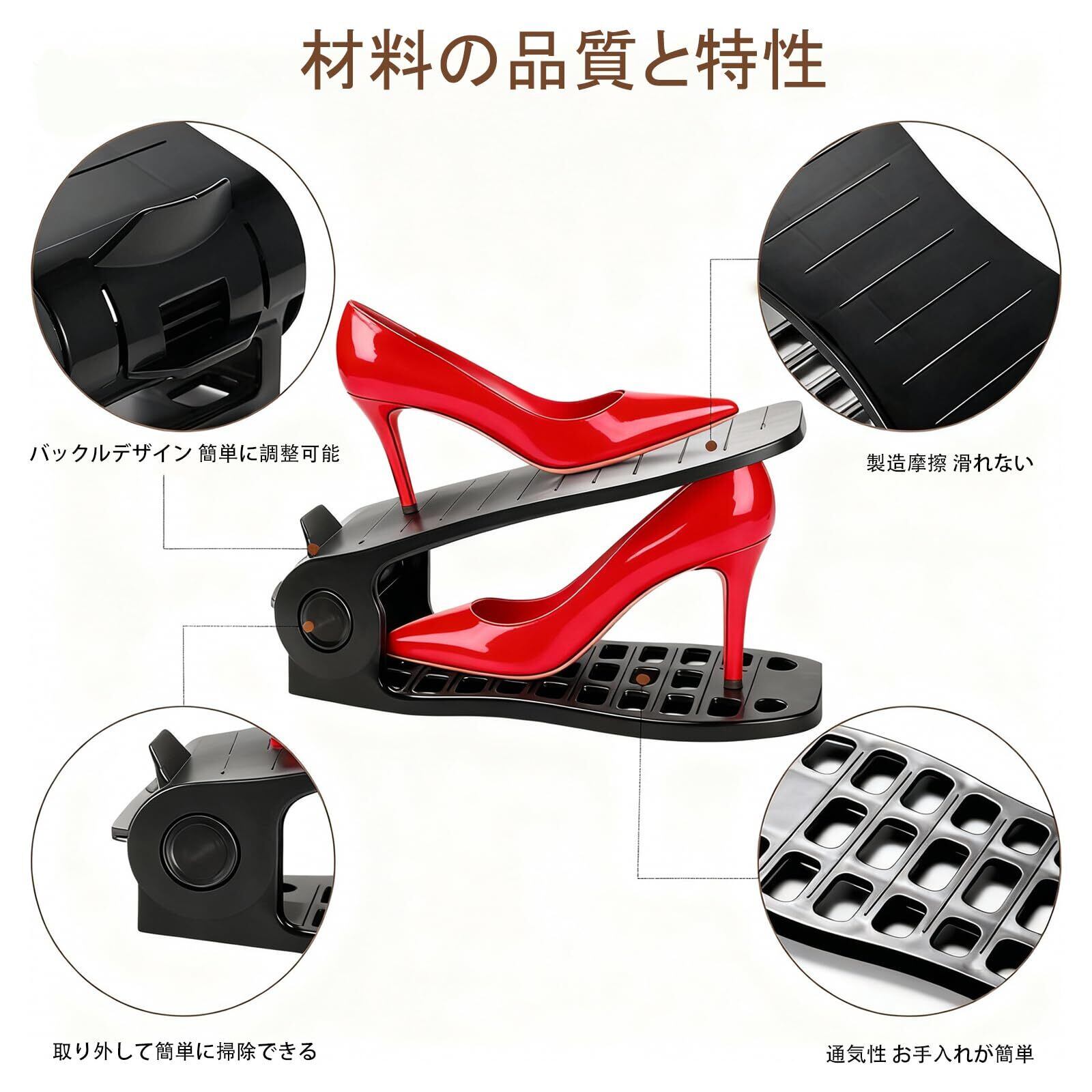 【精密デザイン】幅広でしっかりした作りなので、重い靴、メンズの靴とかも安定感があります。靴は重ならず、靴を傷つけませんホルダー表面は凹凸のある滑り止め加工。靴オーガナイザーは高品質で滑りにくく、靴底のグリップ性に優れています。シューズラックの底には33個の穴があり、靴のほこりが穴に落ち、掃除が簡単になります。あなたの靴収納を清潔に保存できる!