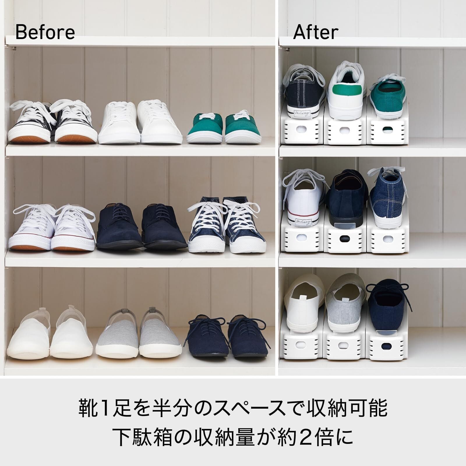 1足分のスペースに2足収納でき、収納量が約2倍にアップ。