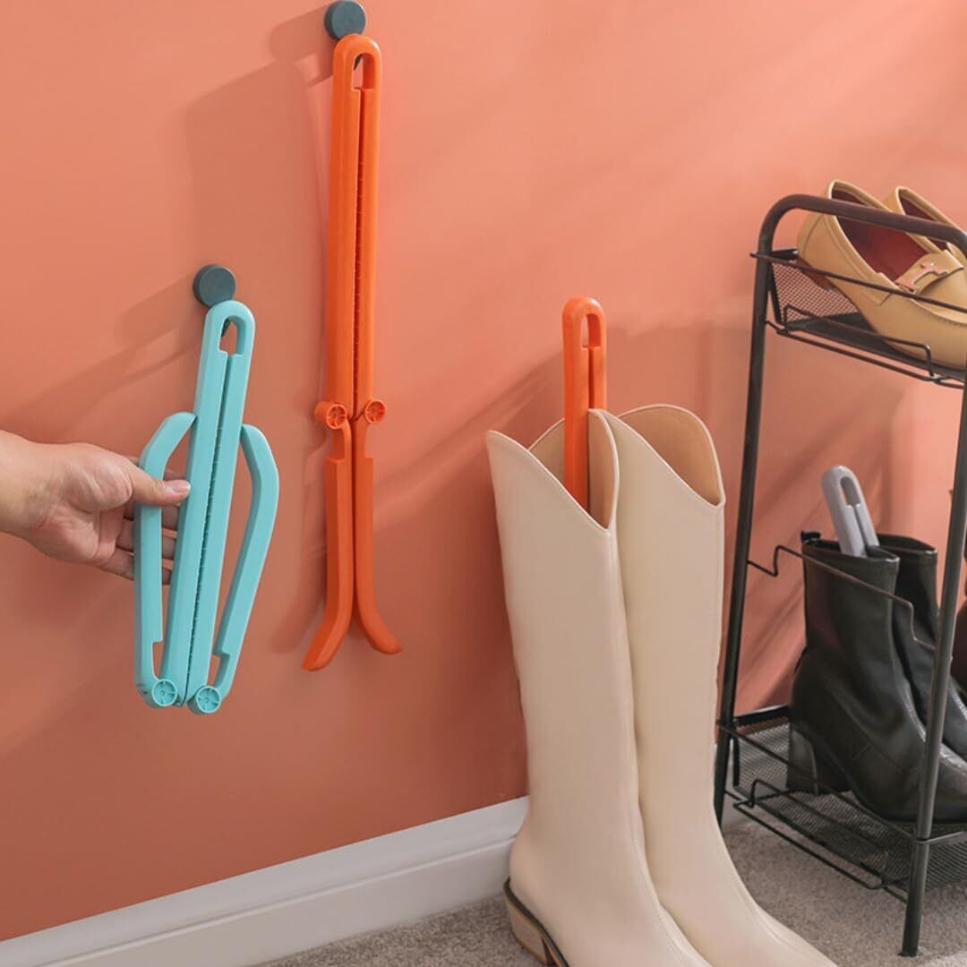 「ブーツのシワ対策」ブーツを直立させて形状をキープし、ひび割れやたるみを効果的に抑えます。ブーツスタンドの活用でブーツをまっすぐに保ち、長く愛用できるように寿命を伸ばせます。折りたたみ式の設計が特徴で、ロングブーツはもちろん、ショートブーツにも対応できます。