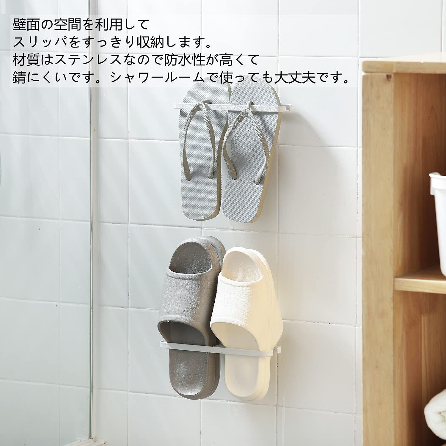 【水に強い素材でバスルームにも最適】 湿気に強い素材と粘着剤を使用。お風呂場のサンダルホルダーとしてだけでなく、タオルハンガーやキッチン用品の整理など、水回りでの使用にも適しています。