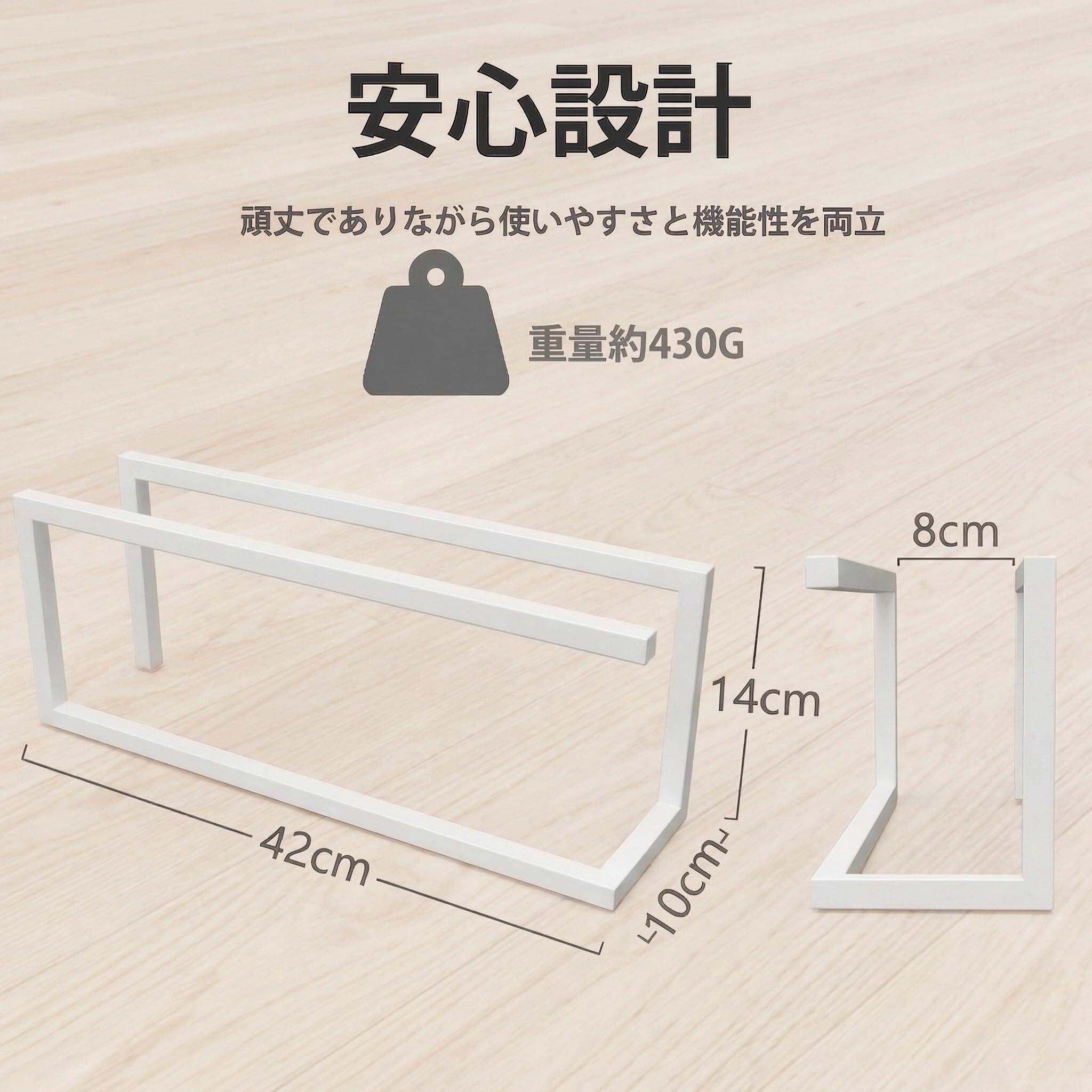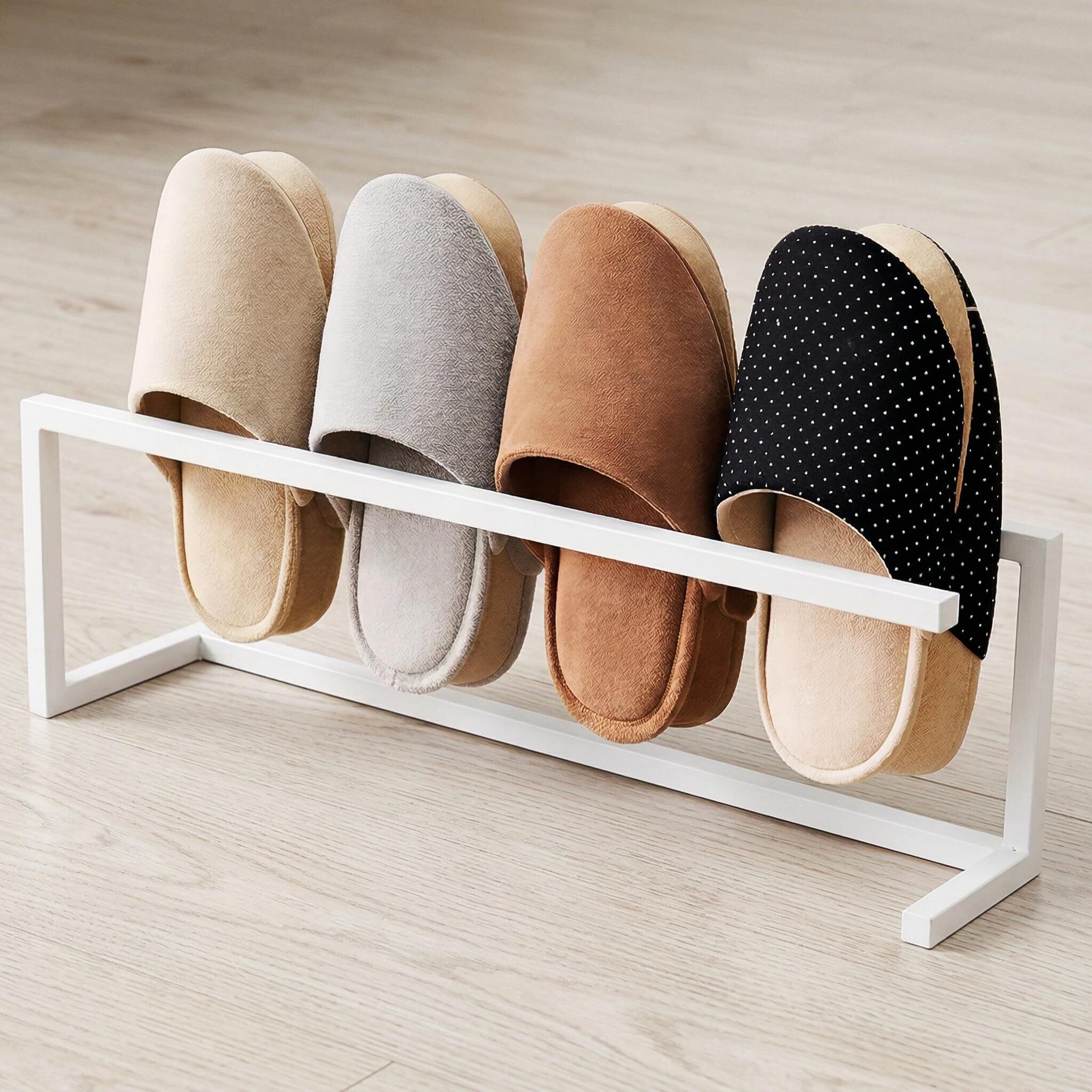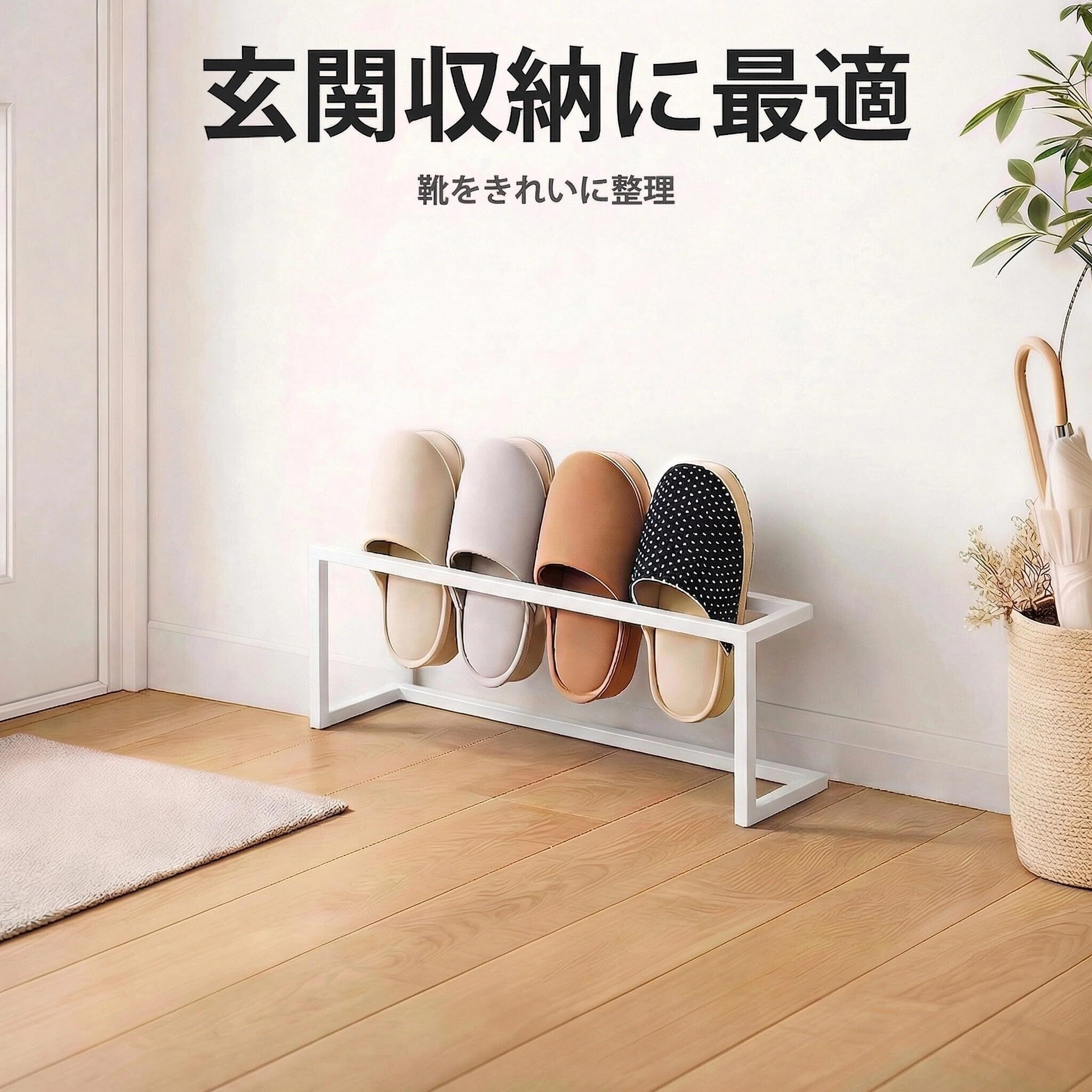 【スリッパラック】サイズ:約42 * 10 * 14cm。重量:430g。素材:鉄。シンプルなスリッパラックです。スリッパを4足まで収納できます。角型の形状であり、壁や部屋の四隅にぴったりと収められます。薄型なので、リビング、浴室などに省スペースで設置できます。スリッパだけでなく、スニーカーの収納にもおすすめです。