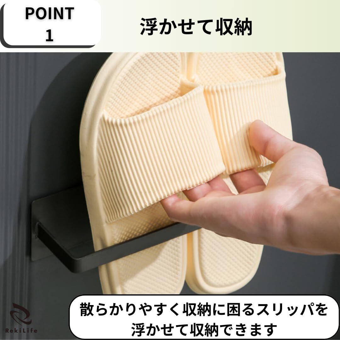【通気性抜群】スリッパを浮かせることにより通気性の良い状態で収納でき、水滴や湿気を逃がしてくれるので清潔な状態を保つことができます。お風呂の掃除用具やバスブーツ、タオルなどをひっかけておくのにもおすすめです。