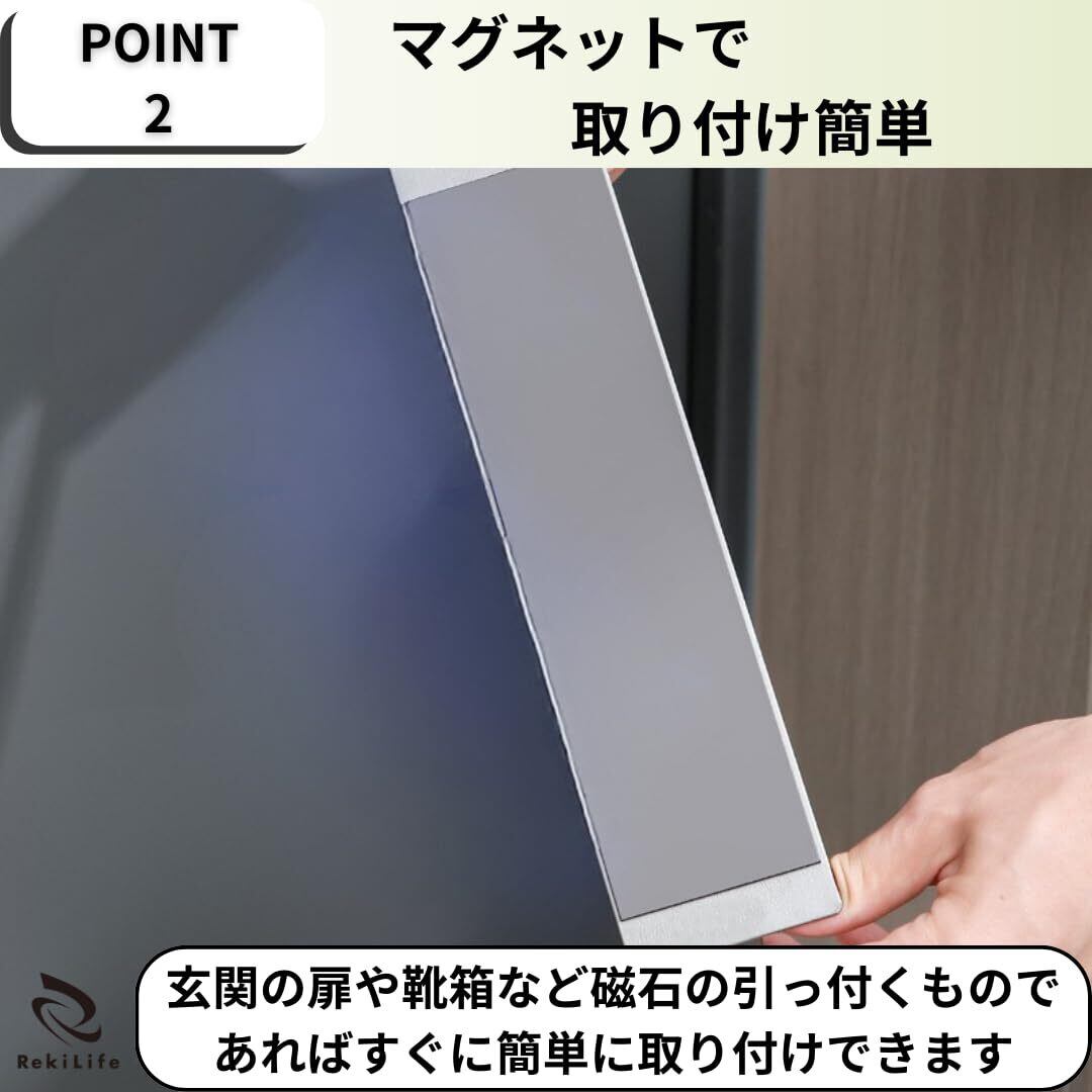 【マグネットで取り付け簡単】玄関の扉や靴箱、浴室のマグネット壁や洗濯機など磁石の引っ付くものであればすぐに簡単に取り付けできます。マグネット取り付けなので設置位置の調整や一時的に取り外しておくなどの使い方も簡単にできます。