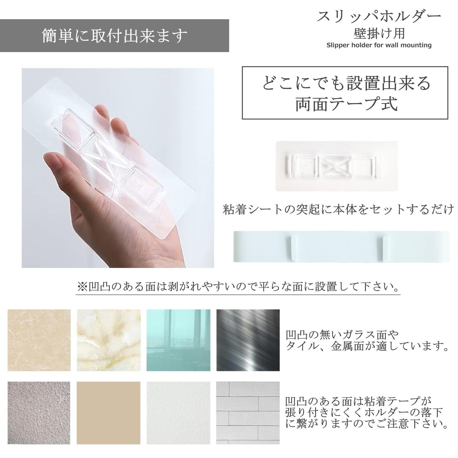 強力粘着テープ式でしっかり固定されます。粘着テープを剥がす際に壁紙等が剥がれてしまう場合がありますので設置場所にはご注意下さい。