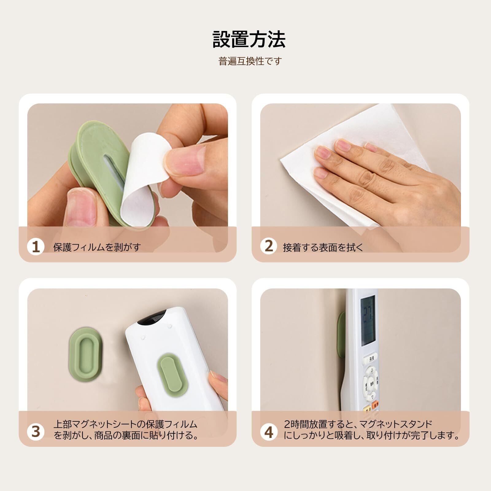 【滑らかな表面に使用】壁掛けタイプリモコンホルダー、ドリルや工具が必要なし、簡単に粘着テープを剥がして、磁気ホルダーを滑らかな壁、ガラス、タイル、家具などに取り付けるだけです。また、粘着テープは簡単に剥がせて、跡を残しません。(ご注意:滑らかな表面のみ使用可能で。革、壁紙、粗い木、粉っぽい表面には使用できません)