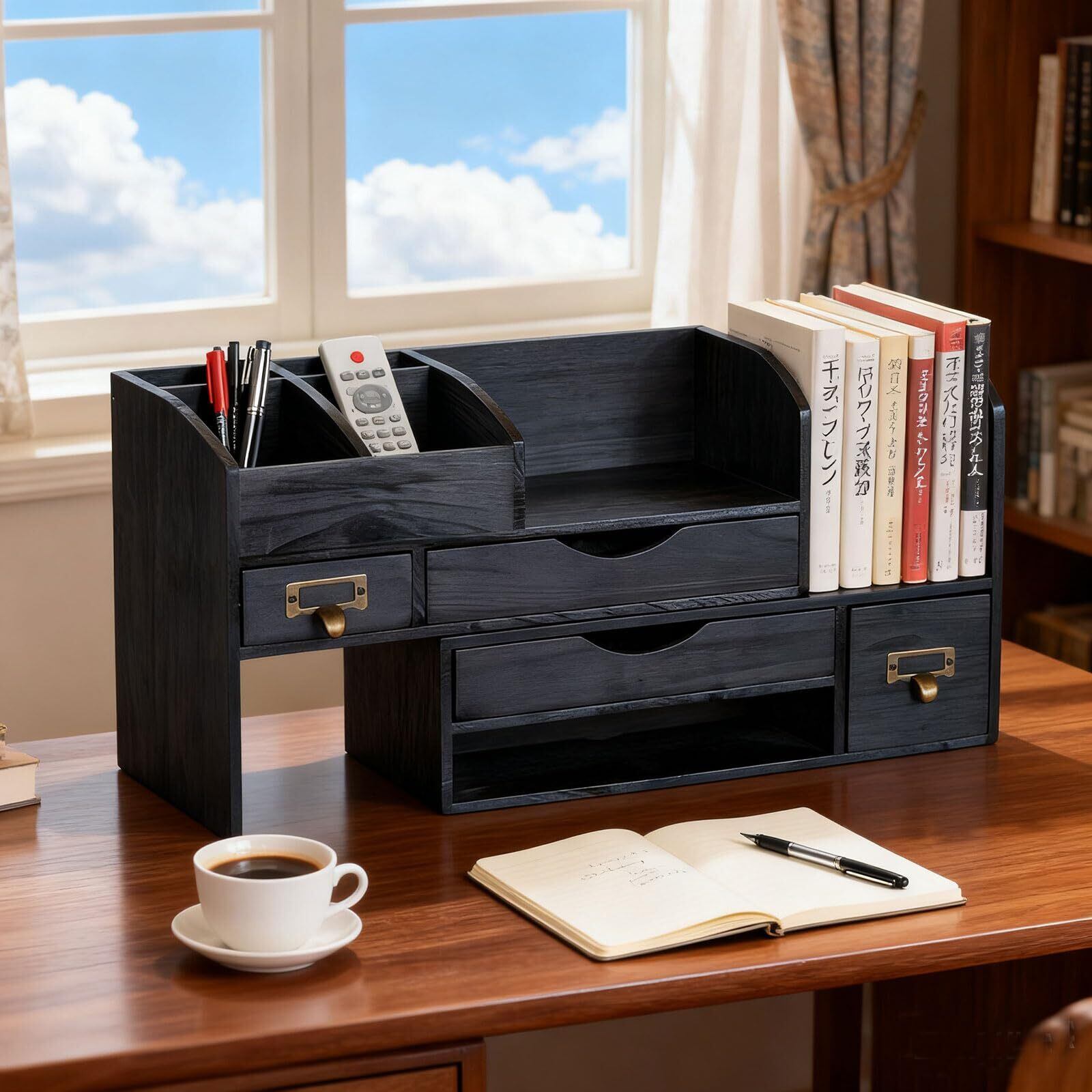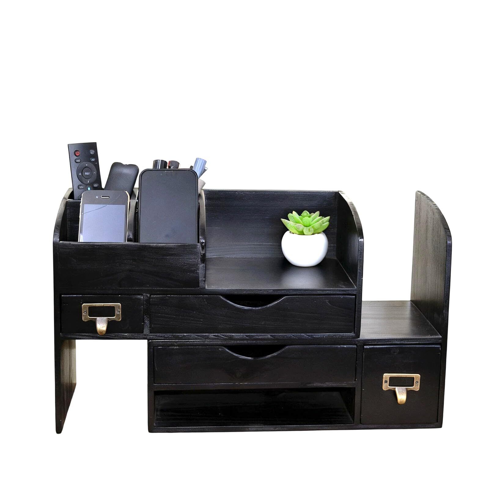 デスクオーガナイザー 小物入れ アクセサリーボックス 卓上収納 多種組み立て方式 伸縮型 本たて ペン立て コスメ 卓上置き棚 リモコンラック (ブラック)