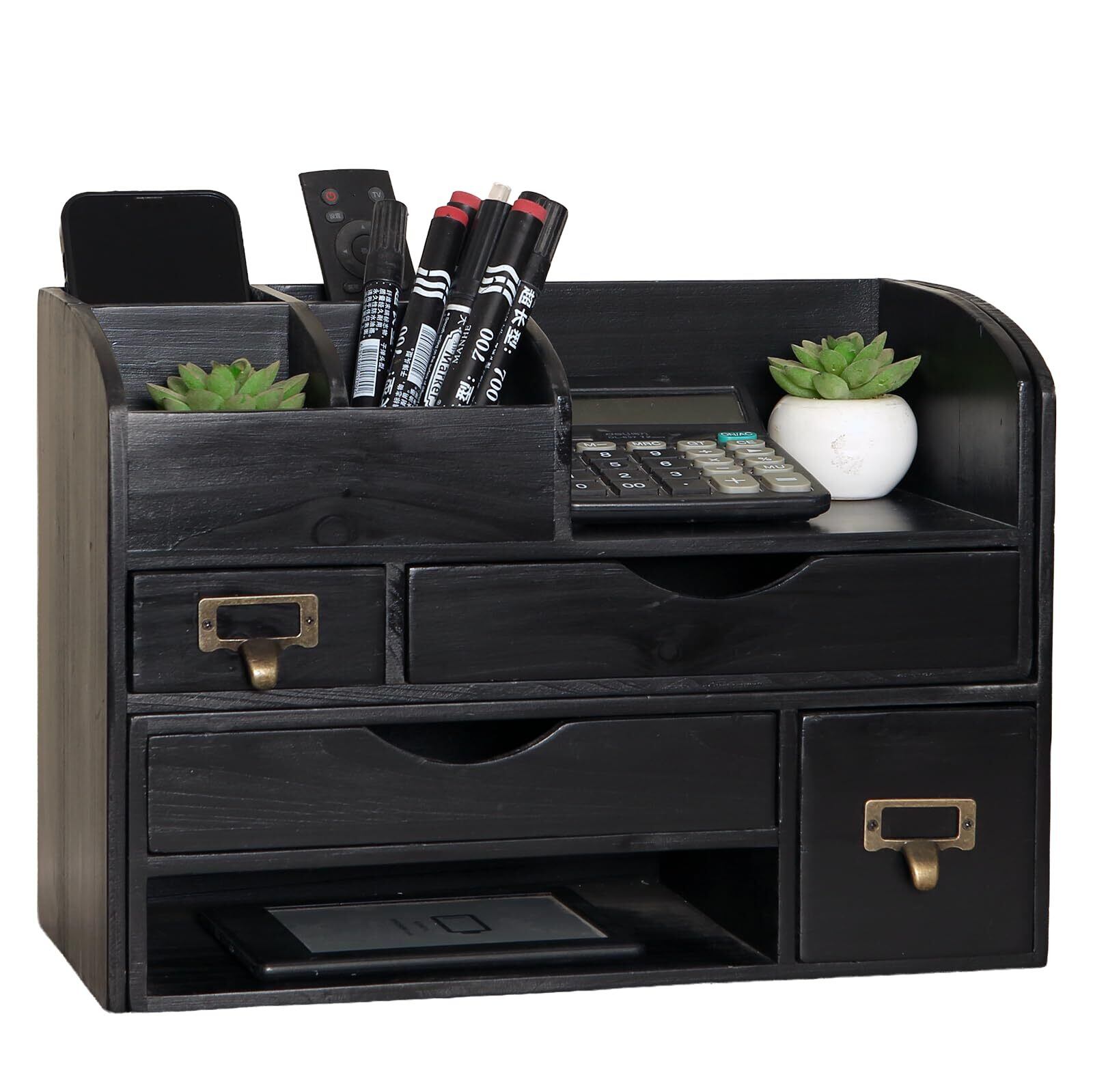 左側:この宝箱は田の字型4区画(各 幅8cm × 奥行8cm × 高さ9cm)でスマホ・ペン・リモコンを分類収納。右側:前面開放型スペース(幅18.5cm × 奥行17cm × 高さ9cm)で電卓・キンドルをラクラク出し入れ。さらに上部奥には隠し引き出し(内寸:幅16cm × 奥行8.5cm × 高さ4cm)で貴重品も安心!