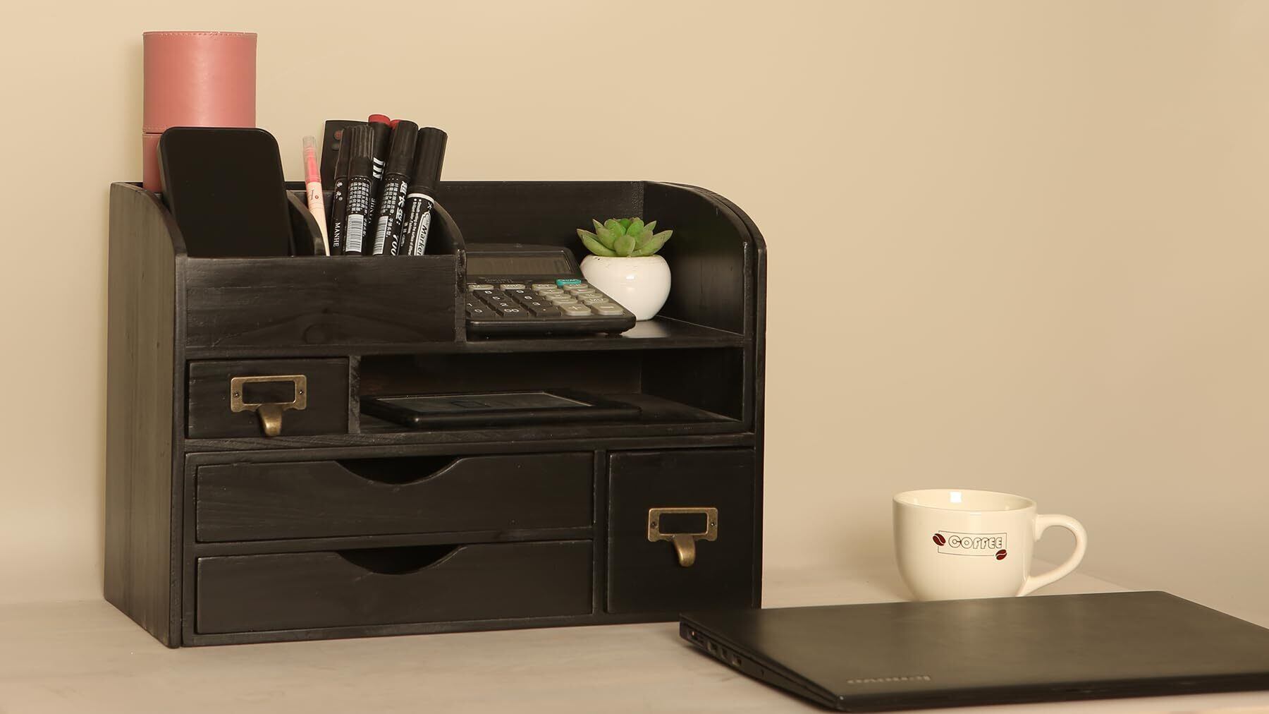 天然素材の風合い&超実用設計|リビング・書斎の収納革命! ナチュラルな木目調デザインが温もりを演出。伸縮機能・多様なサイズの収納スペース・合計4つの引き出しが、スマホからB5書類、カップまで全てを秩序立てて収納。空間効率と使い勝手を両立した究極の収納ソリューションです!