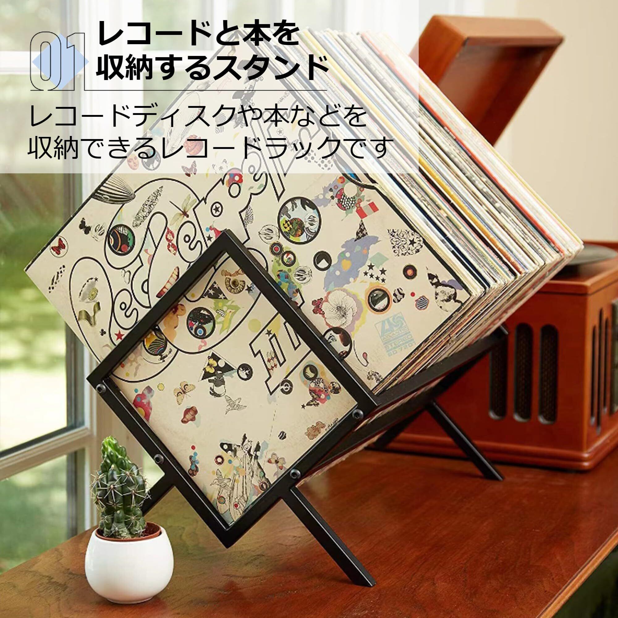 【レコードと本を収納するスタンド】レコードディスクや本などを収納できるレコードラックです。支柱と側部のパーツをボルトで締めるだけで組立簡単です。