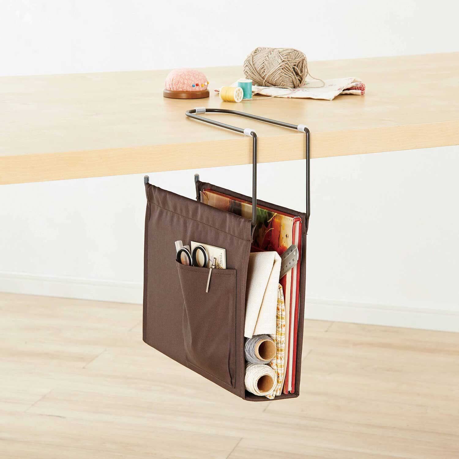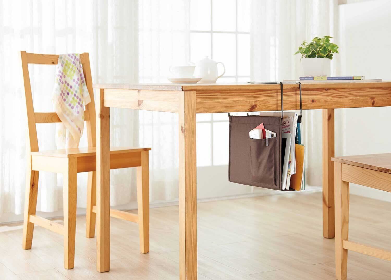 テーブルにひっかけるだけのカンタン設置。読みかけの新聞やチラシ、タブレットや携帯などをパッ!と投げ入れサッ!と片付け。お子様のリビング学習にも。