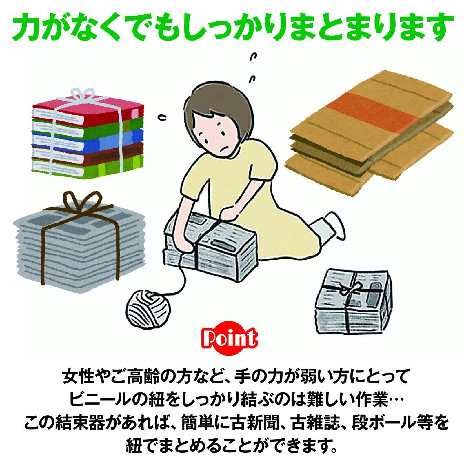 女性やご高齢の方など、手の力が弱い方にとって、ビニールの紐をしっかり結ぶのは難しい作業…この結束器があれば、力がない方でも簡単に古新聞、古雑誌、段ボール等を紐でまとめることができます。