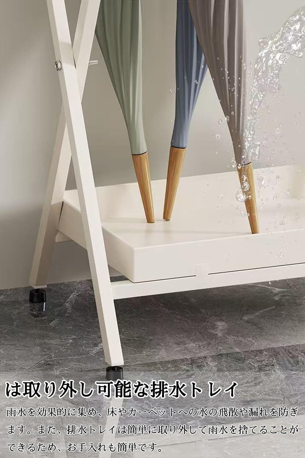 【お手入れ簡単】:当社のコンパクト傘立てには取り外し可能な排水トレイが付いており、雨水を効果的に集め、床やカーペットへの水の飛散や漏れを防ぎます。また、排水トレイは簡単に取り外して雨水を捨てることができるため、お手入れも簡単です。