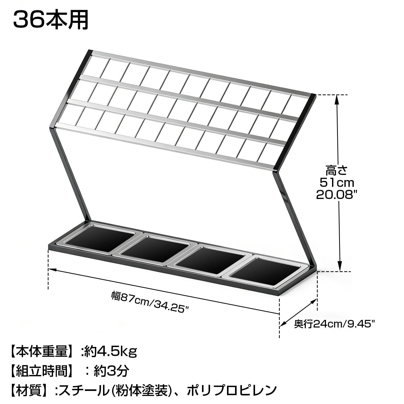 【製品仕様】サイズ:幅87×奥行24×高さ51cm/本体重量(約):4.5Kg/材質:本体・受皿/スチール(粉体塗装)、マット・合成ゴム/組立品 (36本収納)。