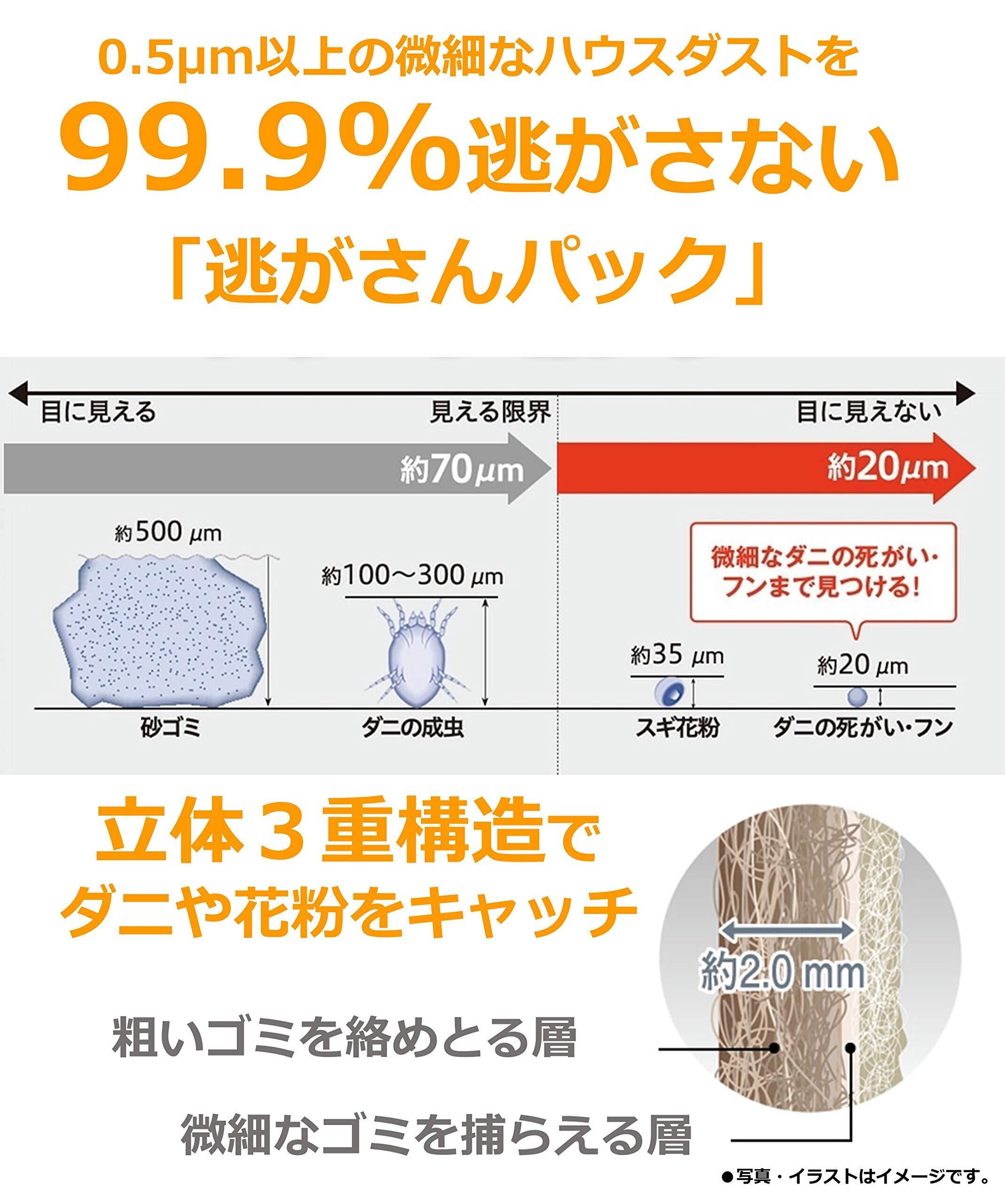 立体三層構造の不織布で、ダニのフンや死がい、花粉など0.5μm以上の微細なハウスダストも約99.9%逃さず、排気の清潔さに配慮する