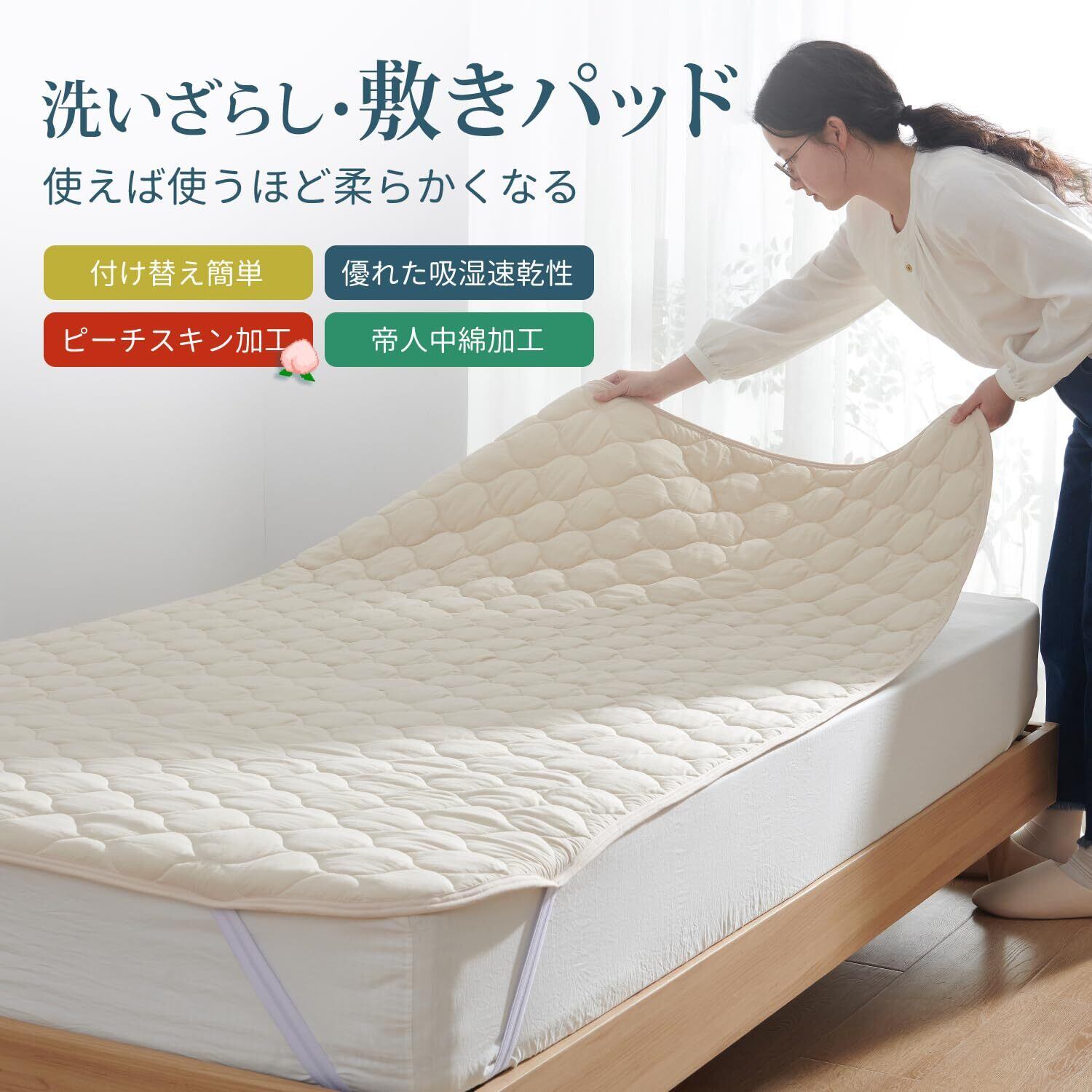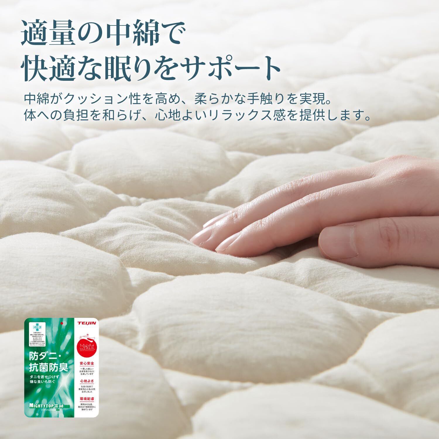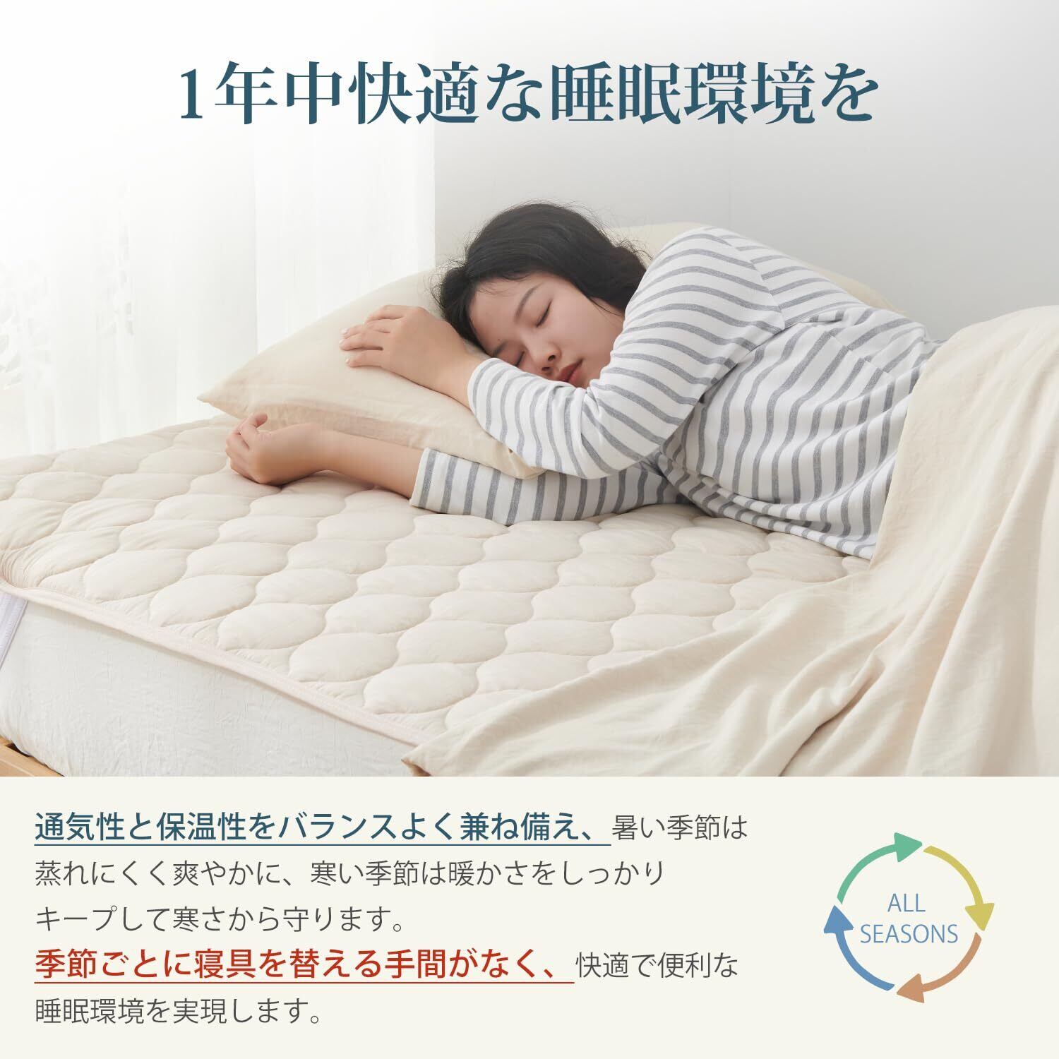 「通気性と速乾性で清潔キープ」高い通気性で湿気を逃し、ムレにくい快適な寝心地を提供します。中綿入りでふんわりとした感触がありながら、速乾性にも優れているため、洗濯後も素早く乾きます。いつでも清潔で快適な睡眠環境を保てます。