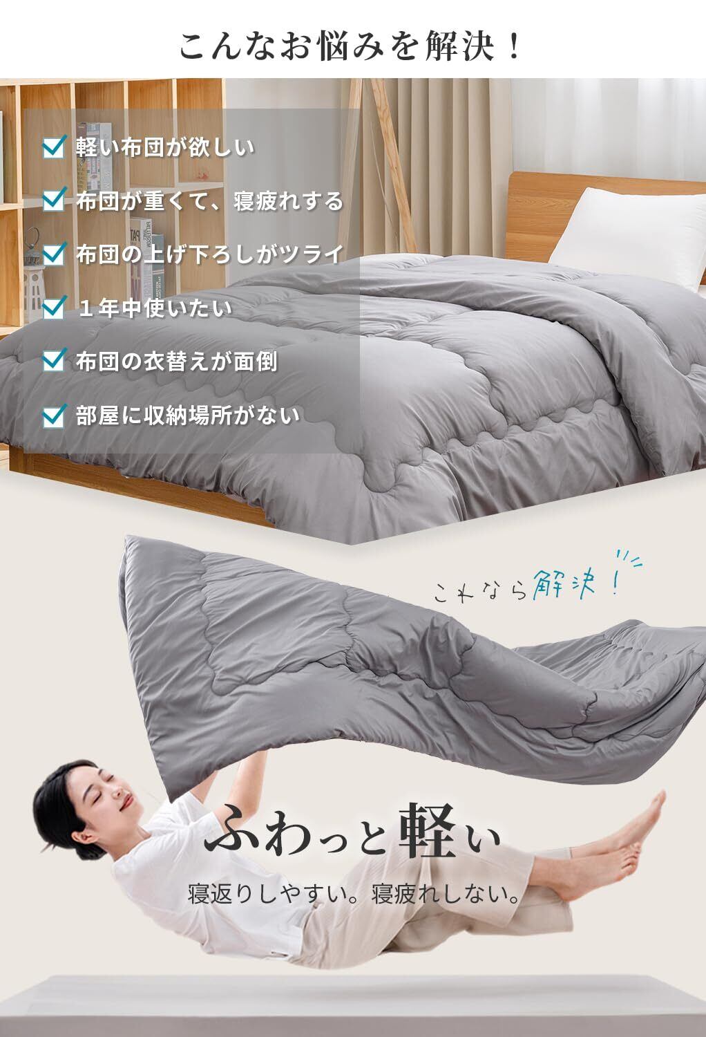 【フワっと軽い!】フワっと軽く体を包んでくれるので、よりリラックスした眠りに。女性でも持ち運びラクラク!来客用にもピッタリです。