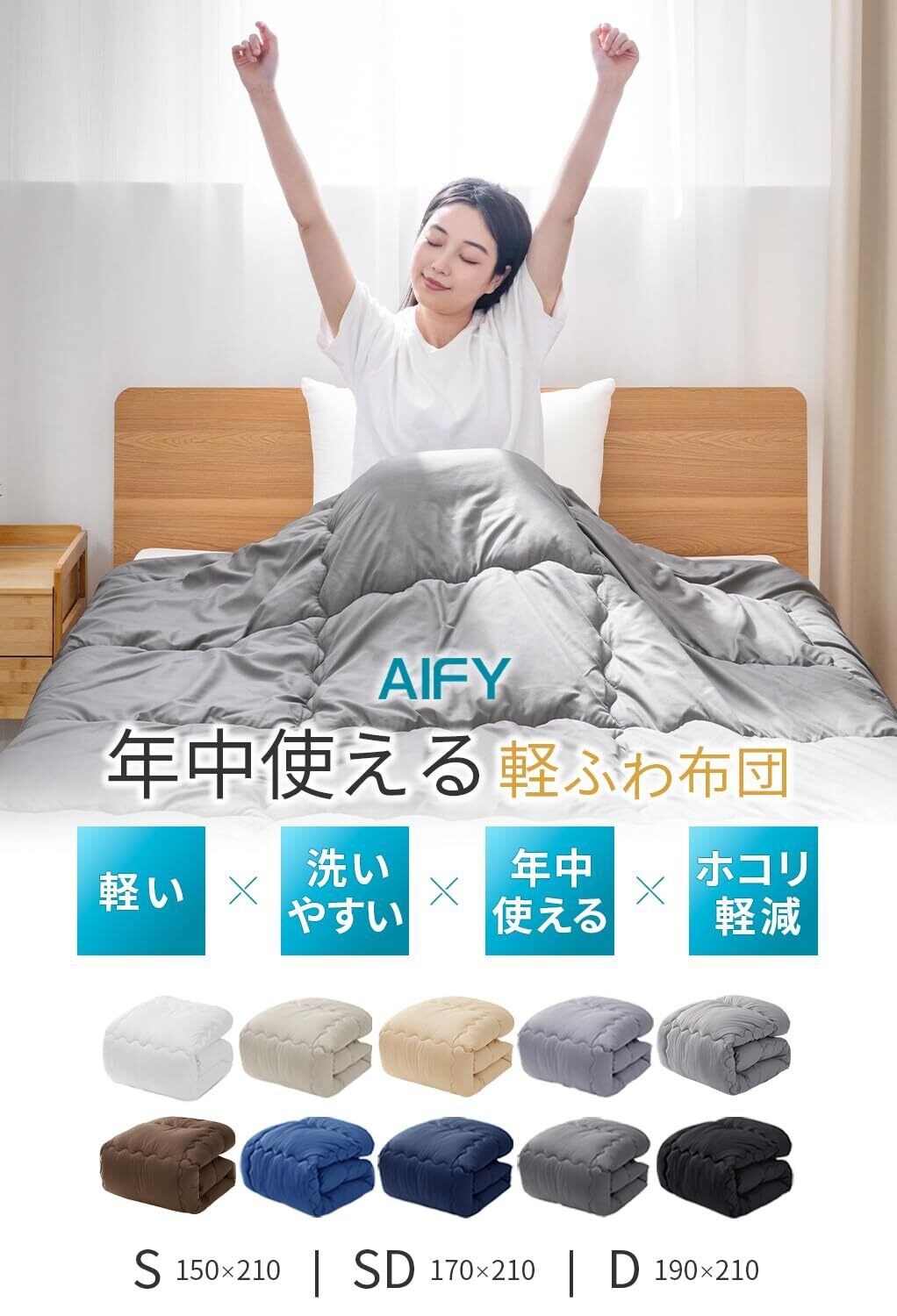 AIFY 掛け布団 シングル オールシーズン 軽量 洗える ふんわり 暖かい 抗菌 防ダニ 通気 グレー 150×210cm (約1.8KG)