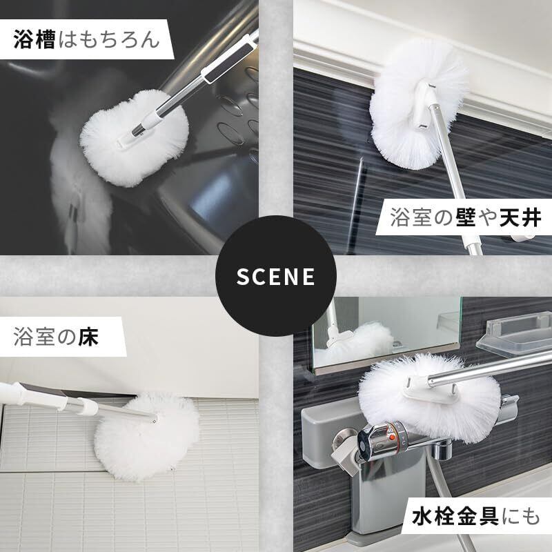 水だけで汚れが落ちる、浴室お掃除用のブラシです。スリムなヘッドなので浴槽や壁の角や水栓まわりの狭いところもしっかりお掃除できます。浴槽、壁、天井、浴槽のフタなど浴室中のお掃除に。 伸縮柄(約38~56cm)ミドルタイプ。